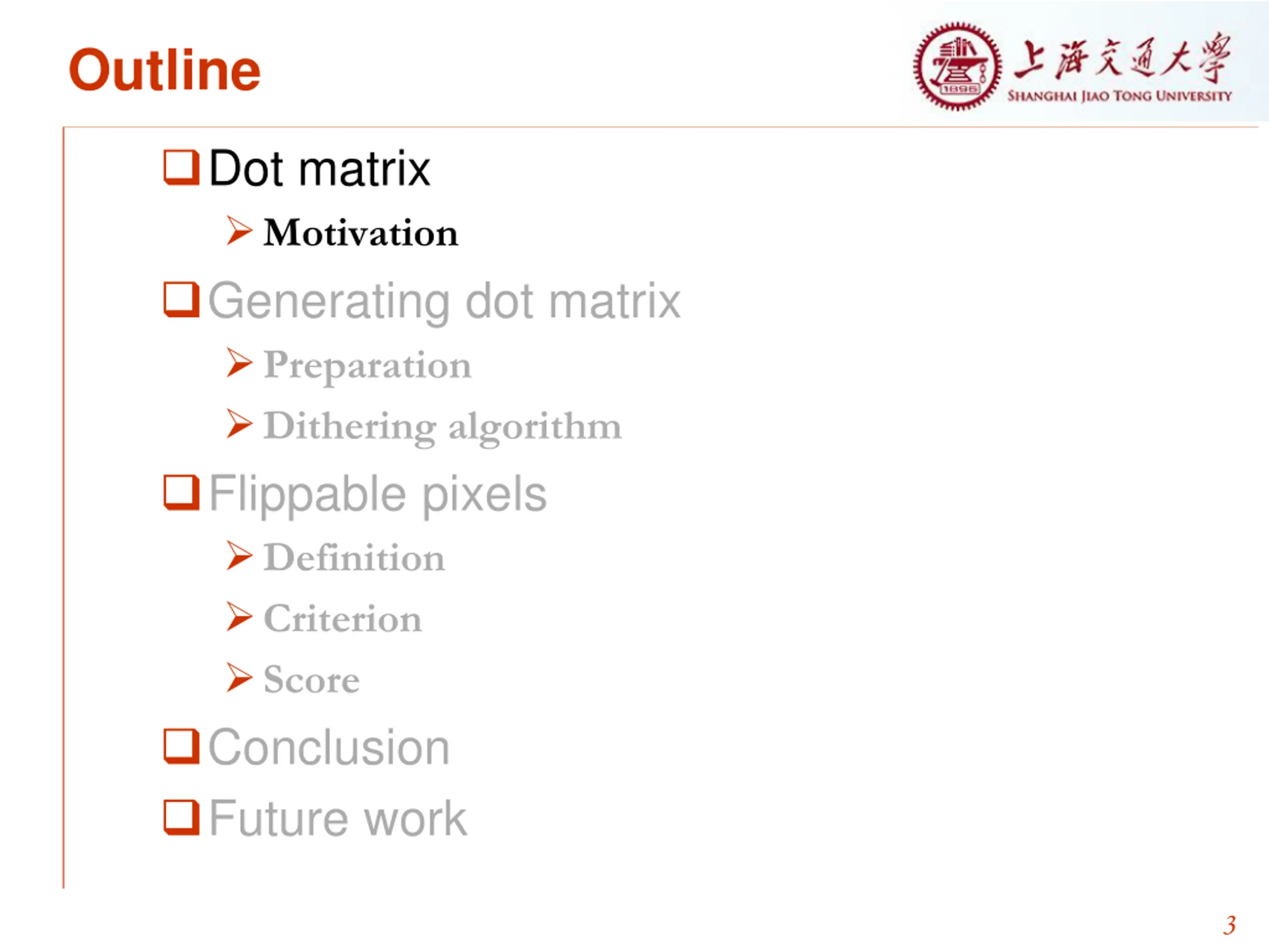 Outline Dot matrix Motivation Generating dot matrix Preparation Dithering algorithm Flippable pixels Definition Criterion Score Conclusion Future work 2