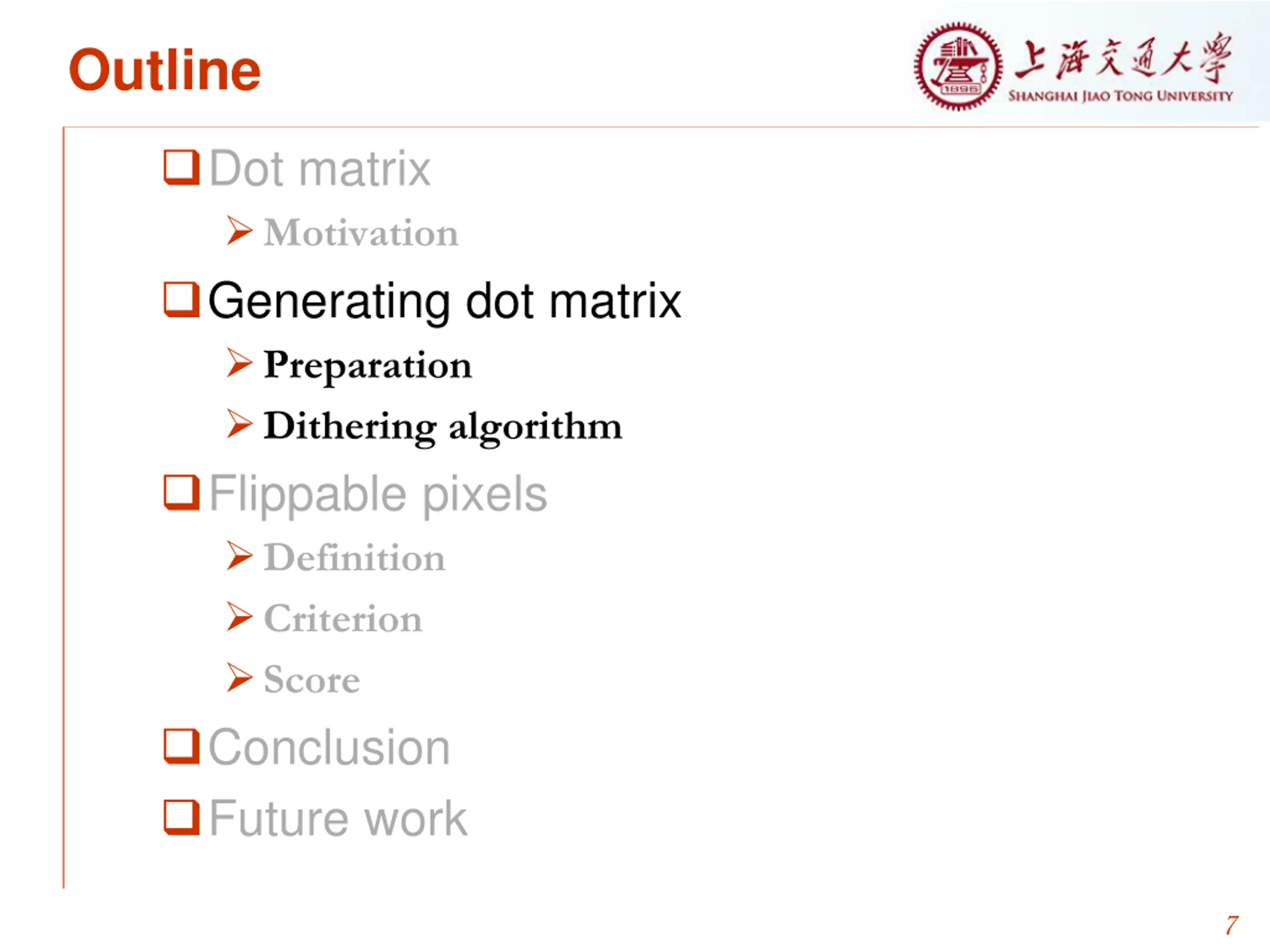 Outline Dot matrix Motivation Generating dot matrix Preparation Dithering algorithm Flippable pixels Definition Criterion Score Conclusion Future work 7