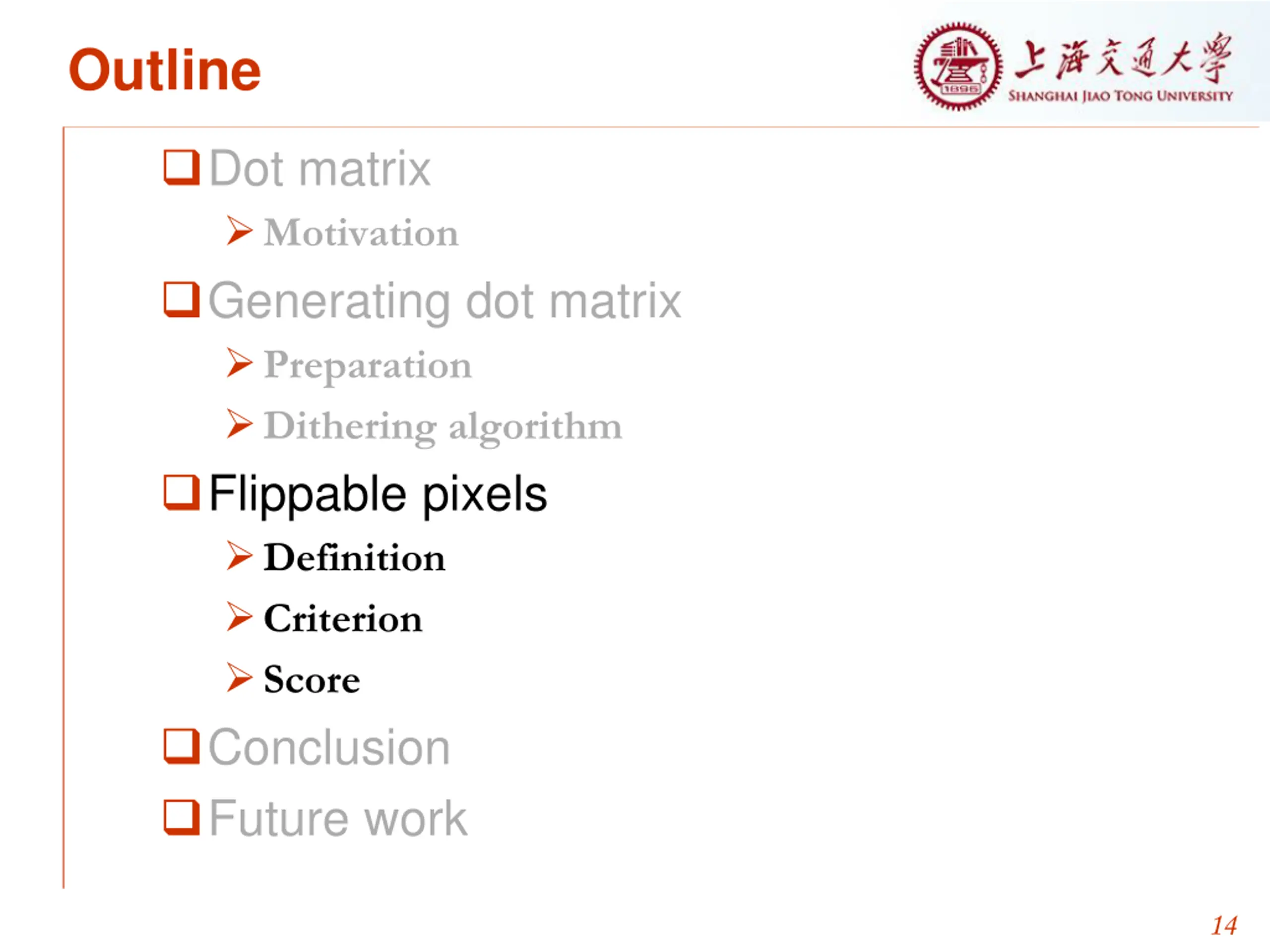 Outline Dot matrix Motivation Generating dot matrix Preparation Dithering algorithm Flippable pixels Definition Criterion Score Conclusion Future work 14