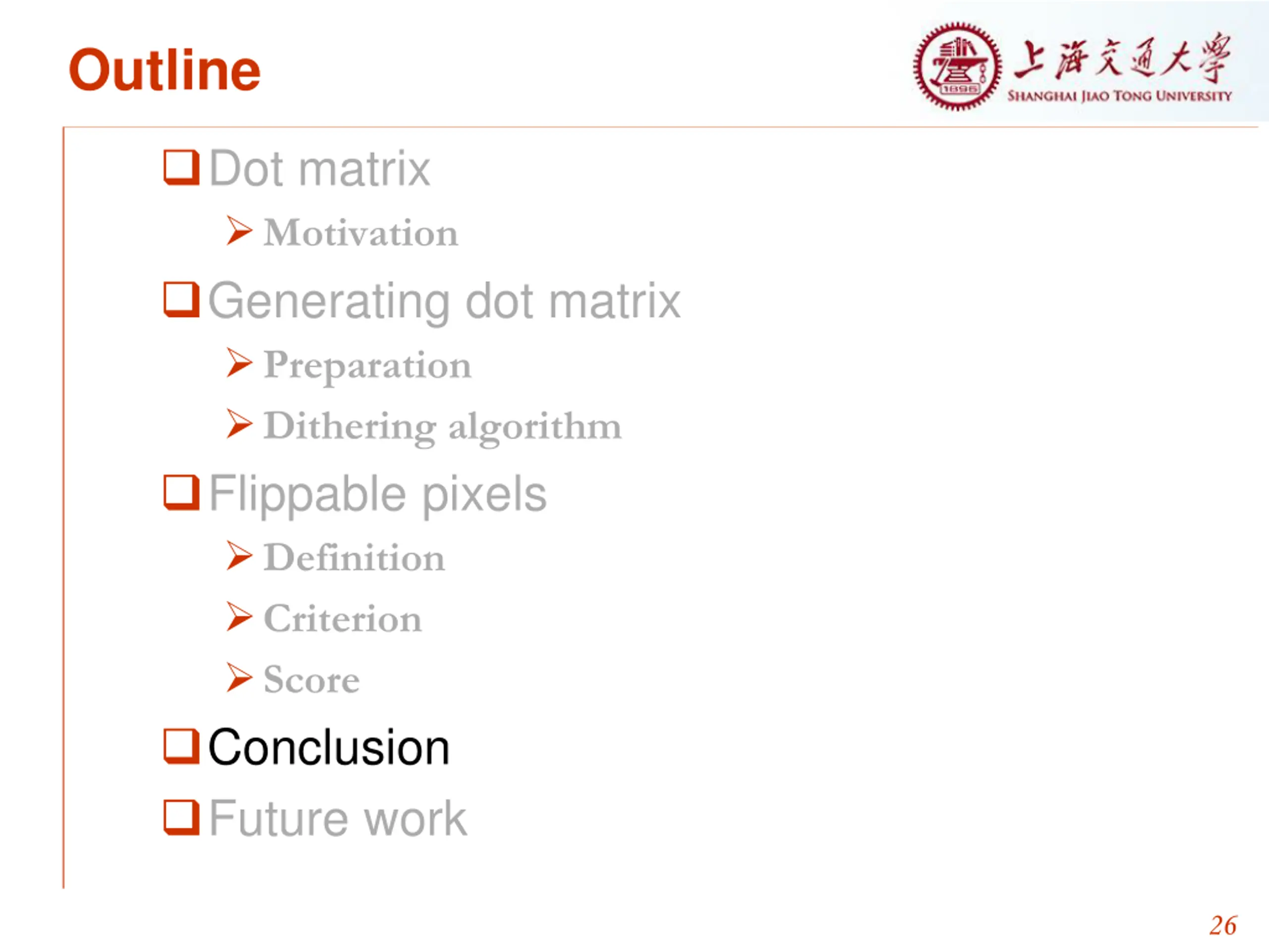 Outline Dot matrix Motivation Generating dot matrix Preparation Dithering algorithm Flippable pixels Definition Criterion Score Conclusion Future work 26