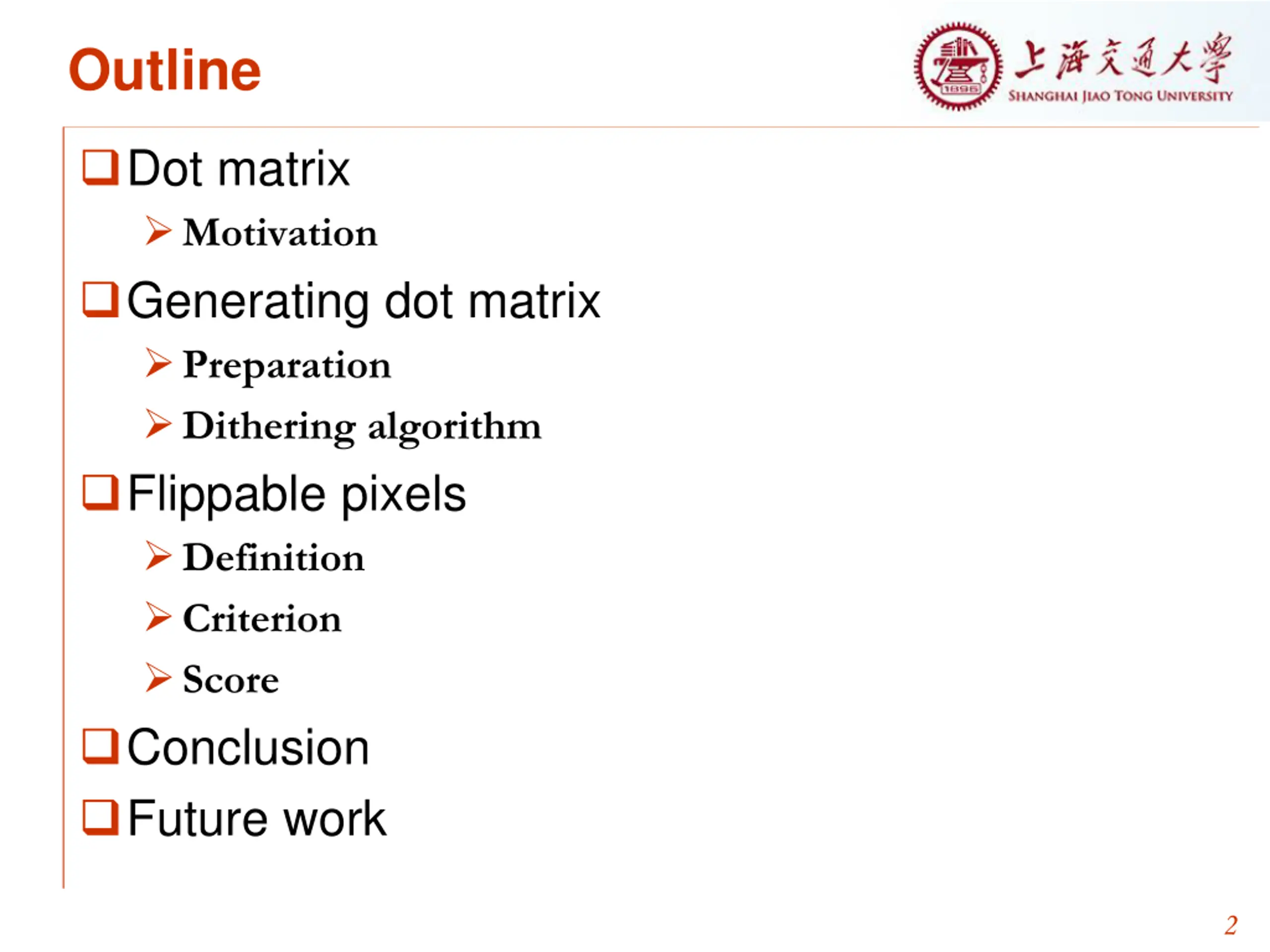 Outline Dot matrix Motivation Generating dot matrix Preparation Dithering algorithm Flippable pixels Definition Criterion Score Conclusion Future work 3