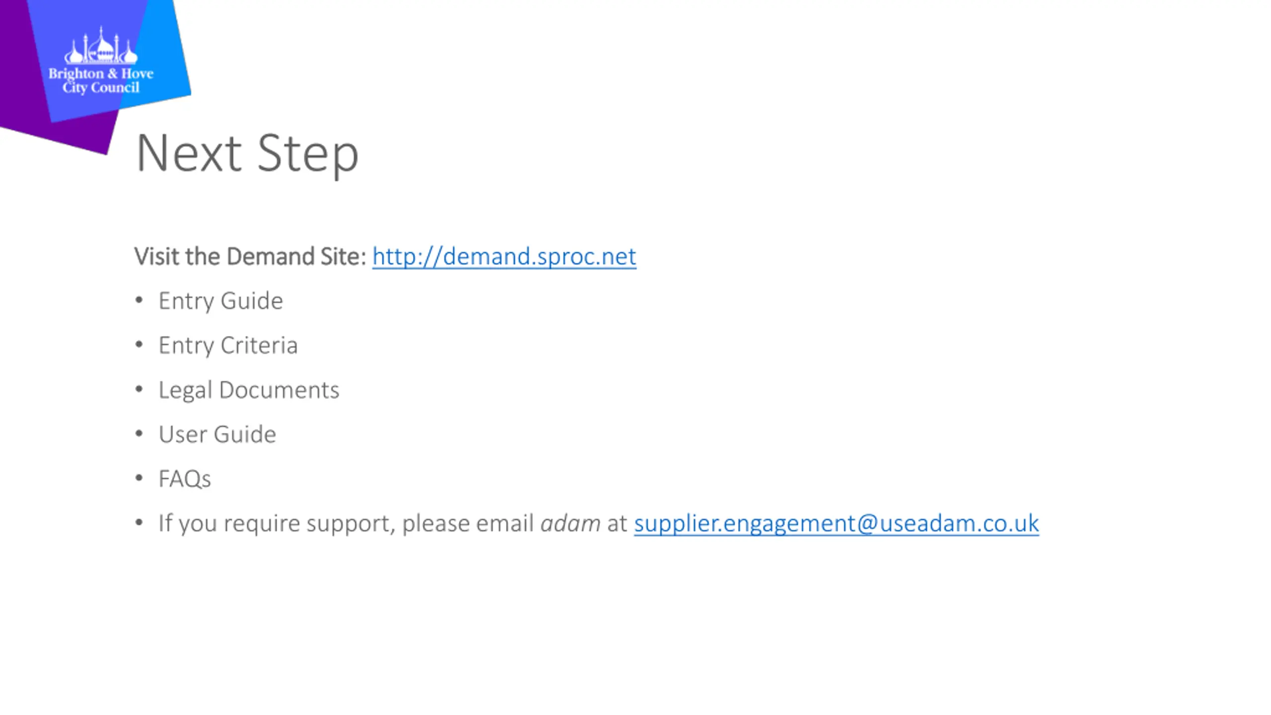 Next Step Visit the Demand Site: Visit the Demand Site: http://demand.sproc.net Entry Guide Entry Criteria Legal Documents User Guide FAQs If you require support, please email adam at supplier.engagement@useadam.co.uk
