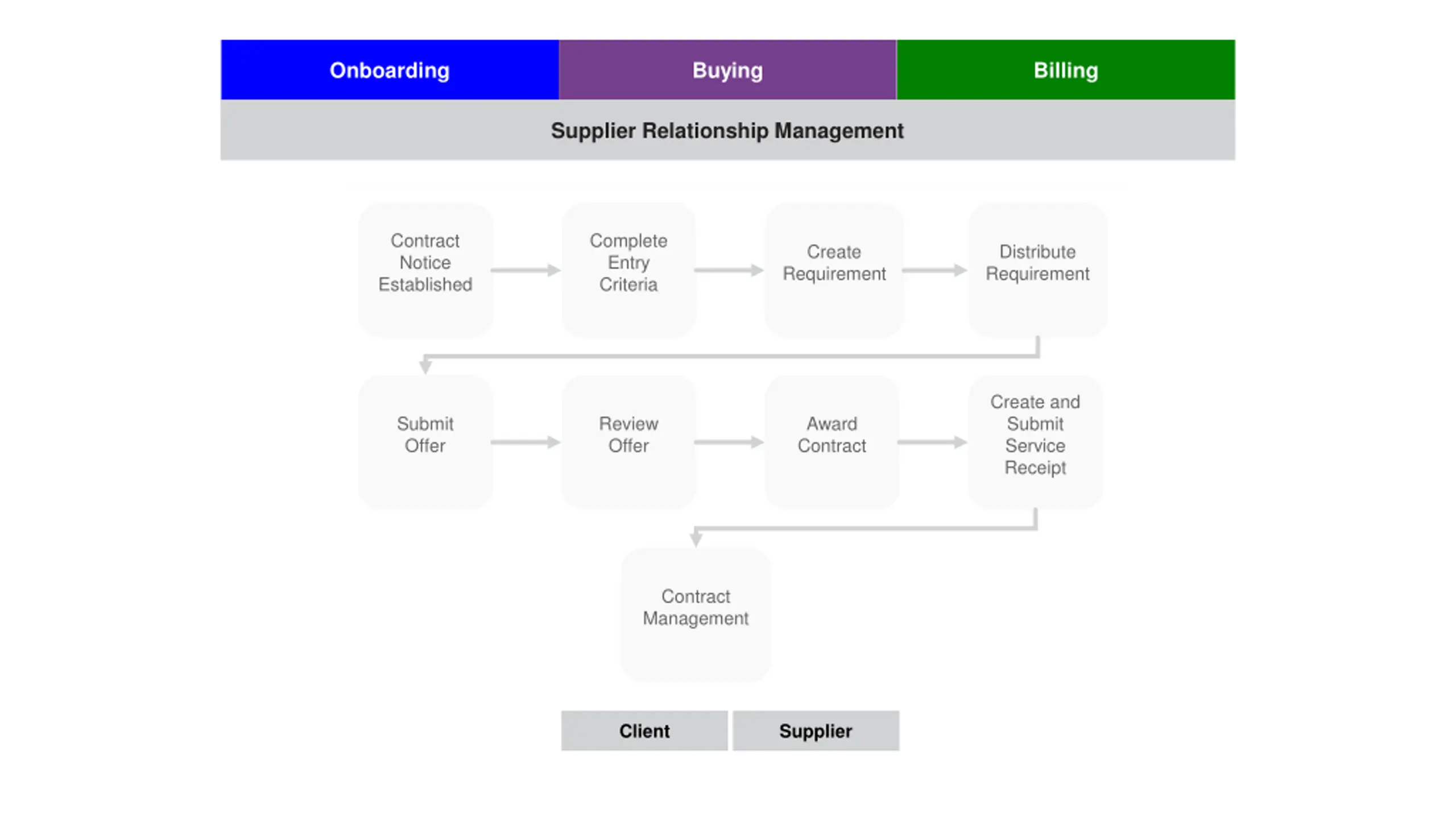 Onboarding Onboarding Buying Billing Supplier Relationship Management Supplier Relationship Management Contract Notice Established Complete Entry Criteria Create Requirement Distribute Requirement Create and Submit Service Receipt Award Contract Submit Offer Review Offer Contract Management Client Supplier