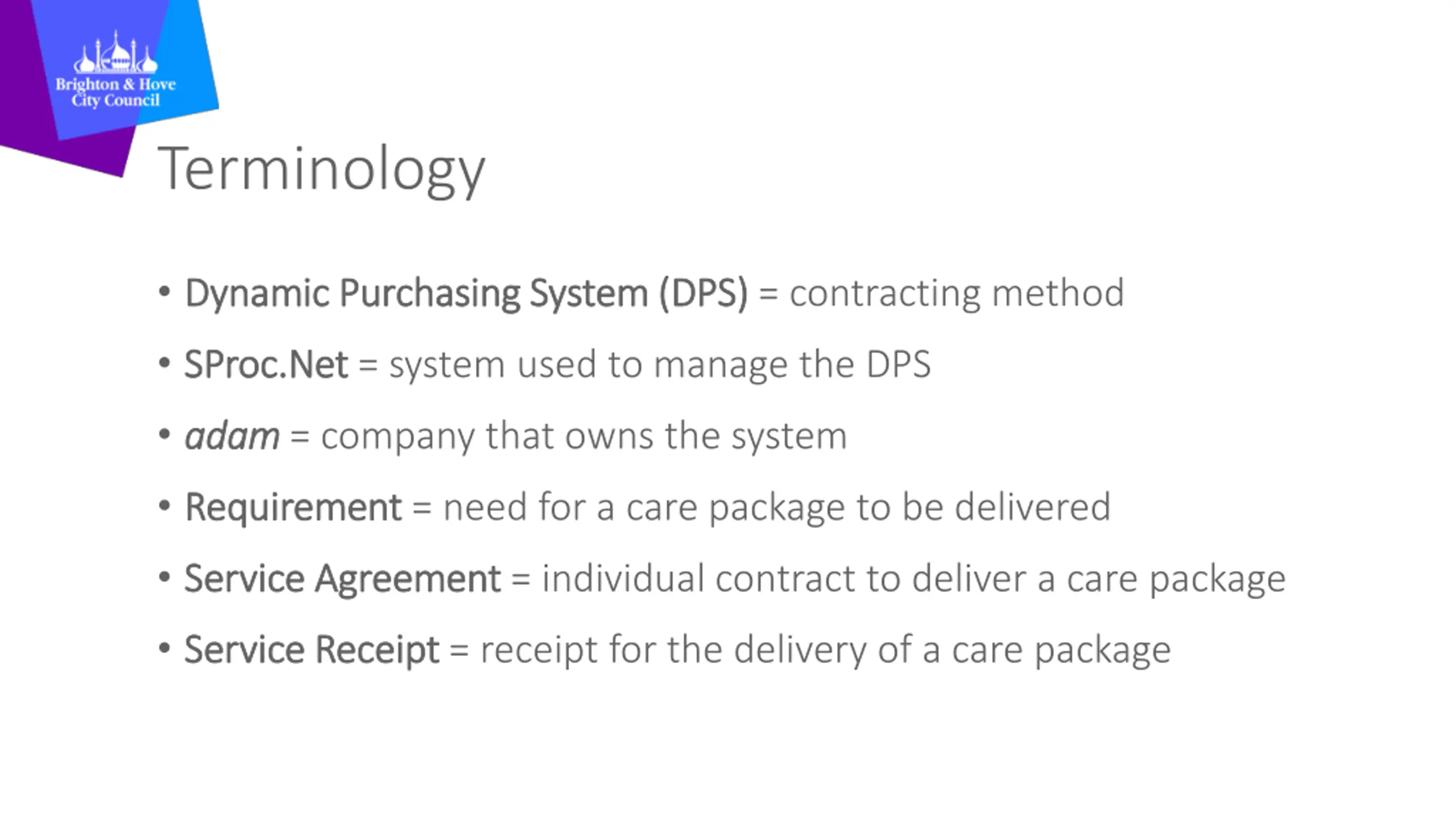 Terminology Dynamic Purchasing System (DPS) Dynamic Purchasing System (DPS) = contracting method SProc.Net SProc.Net = system used to manage the DPS a adam dam= company that owns the system Requirement Requirement = need for a care package to be delivered Service Agreement Service Agreement = individual contract to deliver a care package Service Receipt Service Receipt = receipt for the delivery of a care package