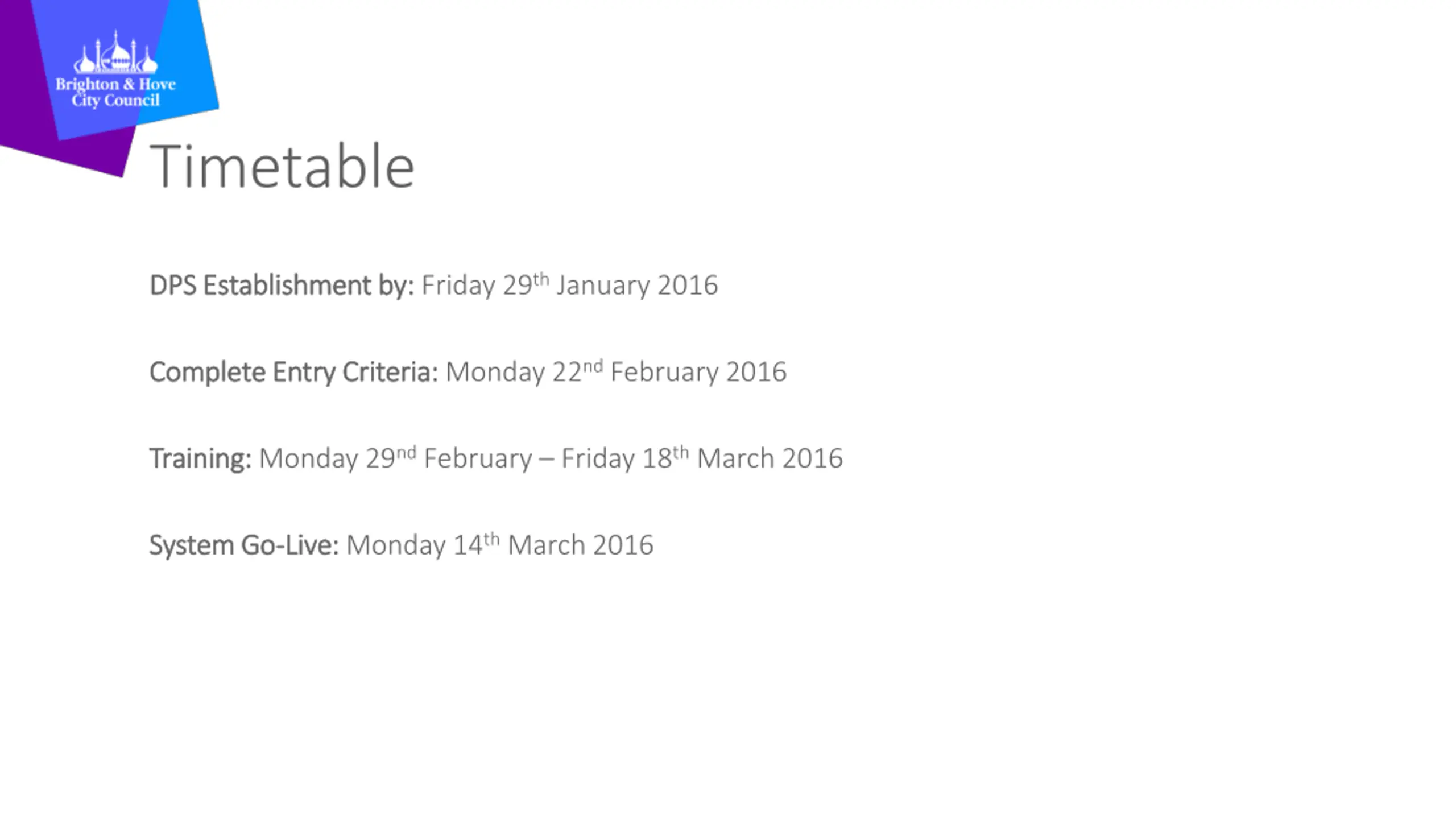 Timetable DPS Establishment by: Friday 29thJanuary 2016 Complete Entry Criteria: Monday 22ndFebruary 2016 Training: Monday 29thFebruary Friday 18thMarch 2016 System Go-Live: Monday 14th March 2016
