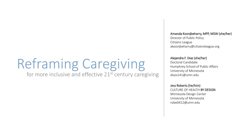 Amanda Amanda Koonjbeharry Koonjbeharry, MPP, MSW (she/her) Director of Public Policy Citizens League akoonjbeharry@citizensleague.org , MPP, MSW (she/her) Alejandra F. Diaz (she/her) Alejandra F. Diaz (she/her) Doctoral Candidate Humphrey School of Public Affairs University of Minnesota diazx141@umn.edu Reframing Caregiving for more inclusive and effective 21st century caregiving Jess Roberts (he/him) Jess Roberts (he/him) CULTURE OF HEALTH BY DESIGN Minnesota Design Center University of Minnesota robe0412@umn.edu BY DESIGN