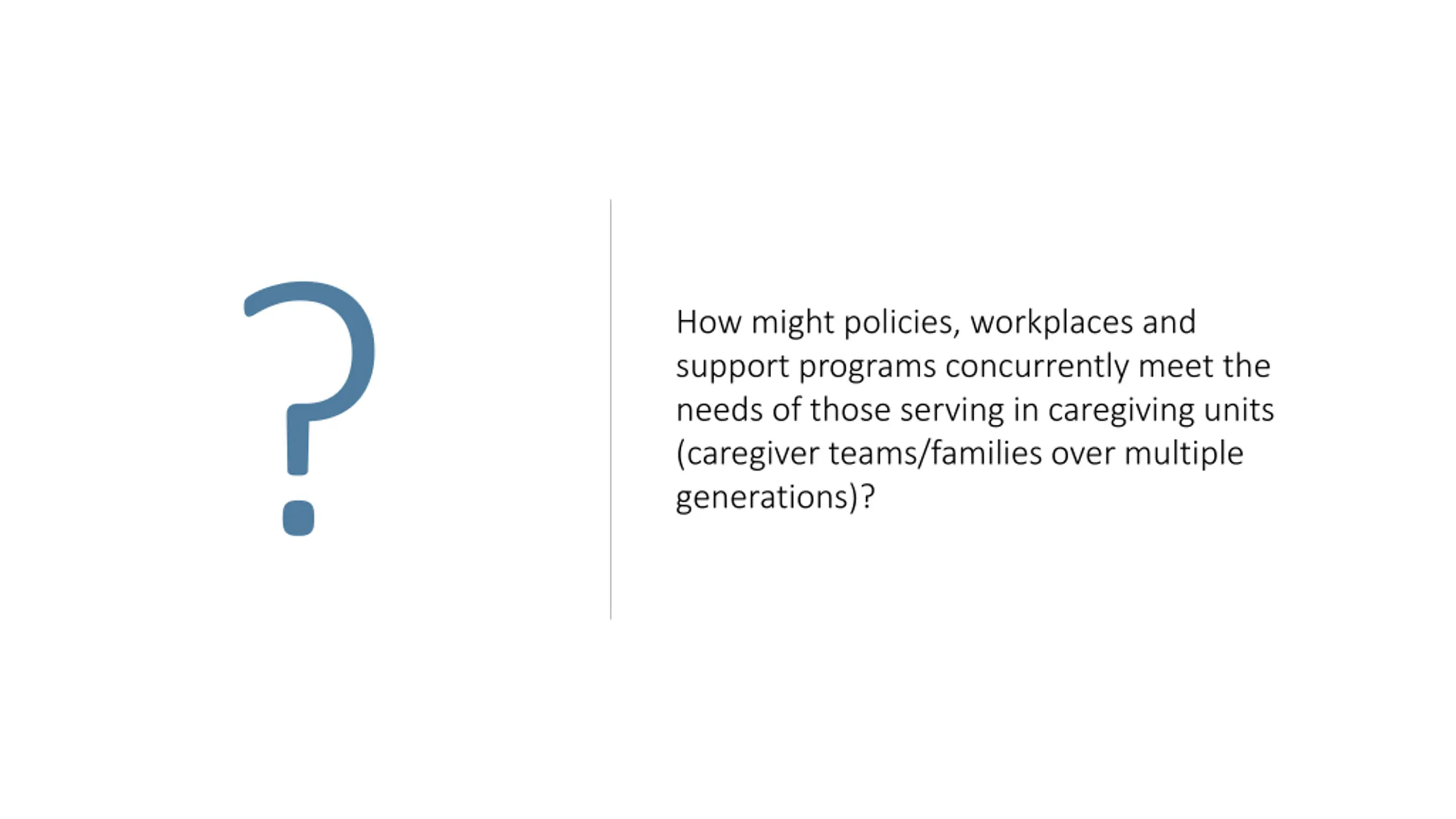 How might policies, workplaces and support programs concurrently meet the needs of those serving in caregiving units (caregiver teams/families over multiple generations)?
