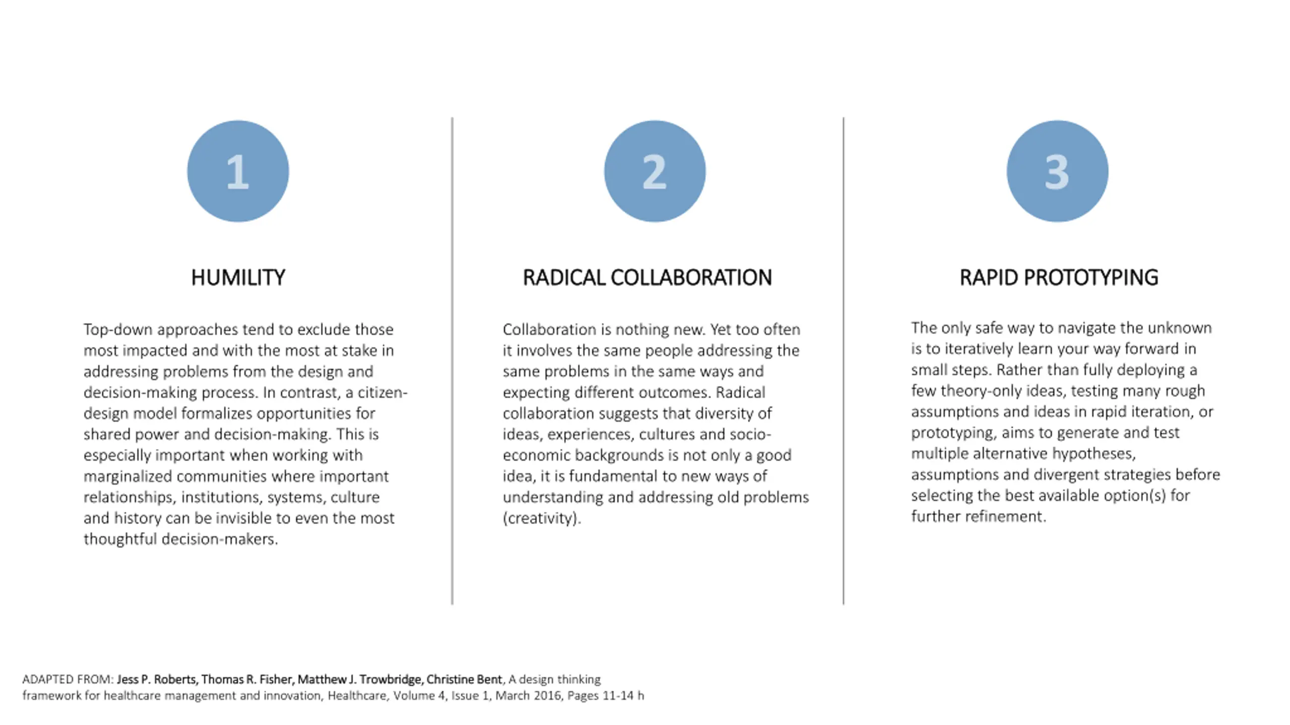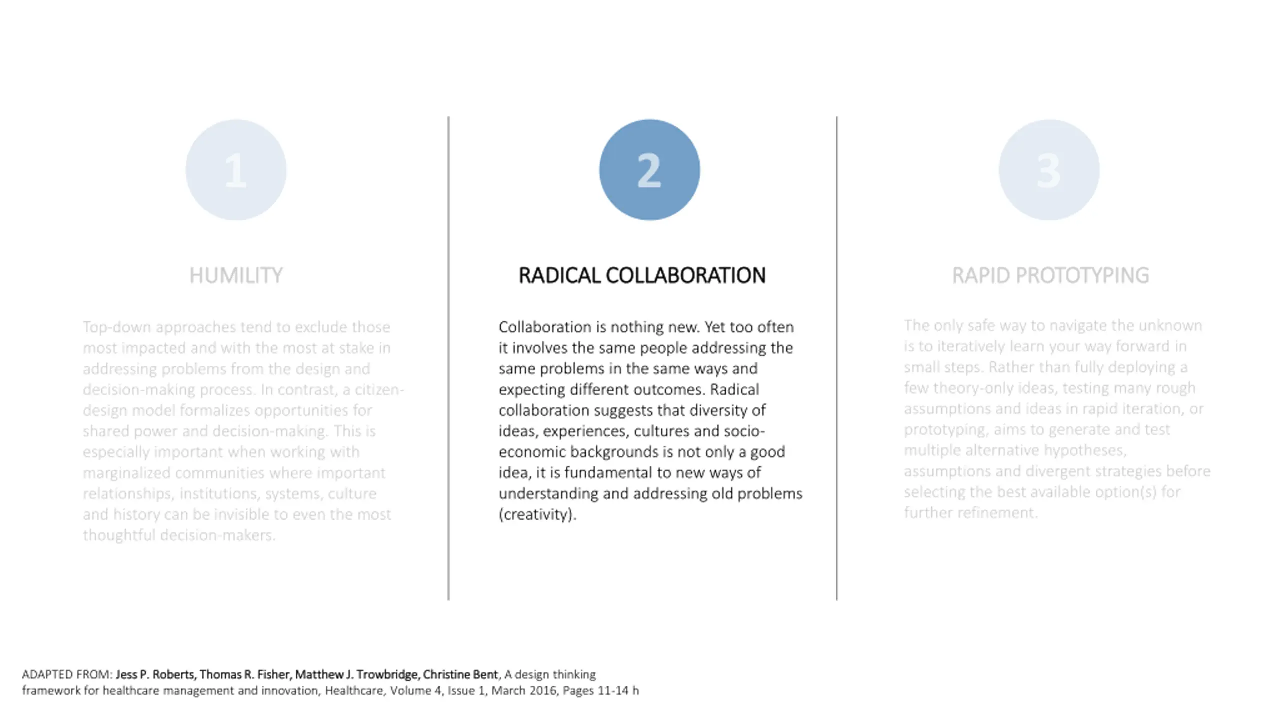 1 2 3 HUMILITY HUMILITY RADICAL COLLABORATION RADICAL COLLABORATION RAPID PROTOTYPING RAPID PROTOTYPING The only safe way to navigate the unknown is to iteratively learn your way forward in small steps. Rather than fully deploying a few theory-only ideas, testing many rough assumptions and ideas in rapid iteration, or prototyping, aims to generate and test multiple alternative hypotheses, assumptions and divergent strategies before selecting the best available option(s) for further refinement. Top-down approaches tend to exclude those most impacted and with the most at stake in addressing problems from the design and decision-making process. In contrast, a citizen- design model formalizes opportunities for shared power and decision-making. This is especially important when working with marginalized communities where important relationships, institutions, systems, culture and history can be invisible to even the most thoughtful decision-makers. Collaboration is nothing new. Yet too often it involves the same people addressing the same problems in the same ways and expecting different outcomes. Radical collaboration suggests that diversity of ideas, experiences, cultures and socio- economic backgrounds is not only a good idea, it is fundamental to new ways of understanding and addressing old problems (creativity). ADAPTED FROM: Jess P. Roberts, Thomas R. Fisher, Matthew J. Trowbridge, Christine Bent Jess P. Roberts, Thomas R. Fisher, Matthew J. Trowbridge, Christine Bent, A design thinking framework for healthcare management and innovation, Healthcare, Volume 4, Issue 1, March 2016, Pages 11-14 h