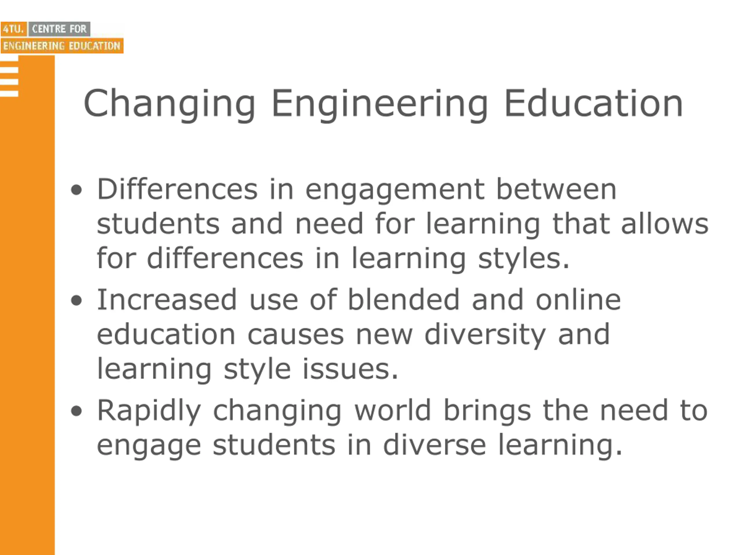 Changing Engineering Education Differences in engagement between students and need for learning that allows for differences in learning styles. Increased use of blended and online education causes new diversity and learning style issues. Rapidly changing world brings the need to engage students in diverse learning.