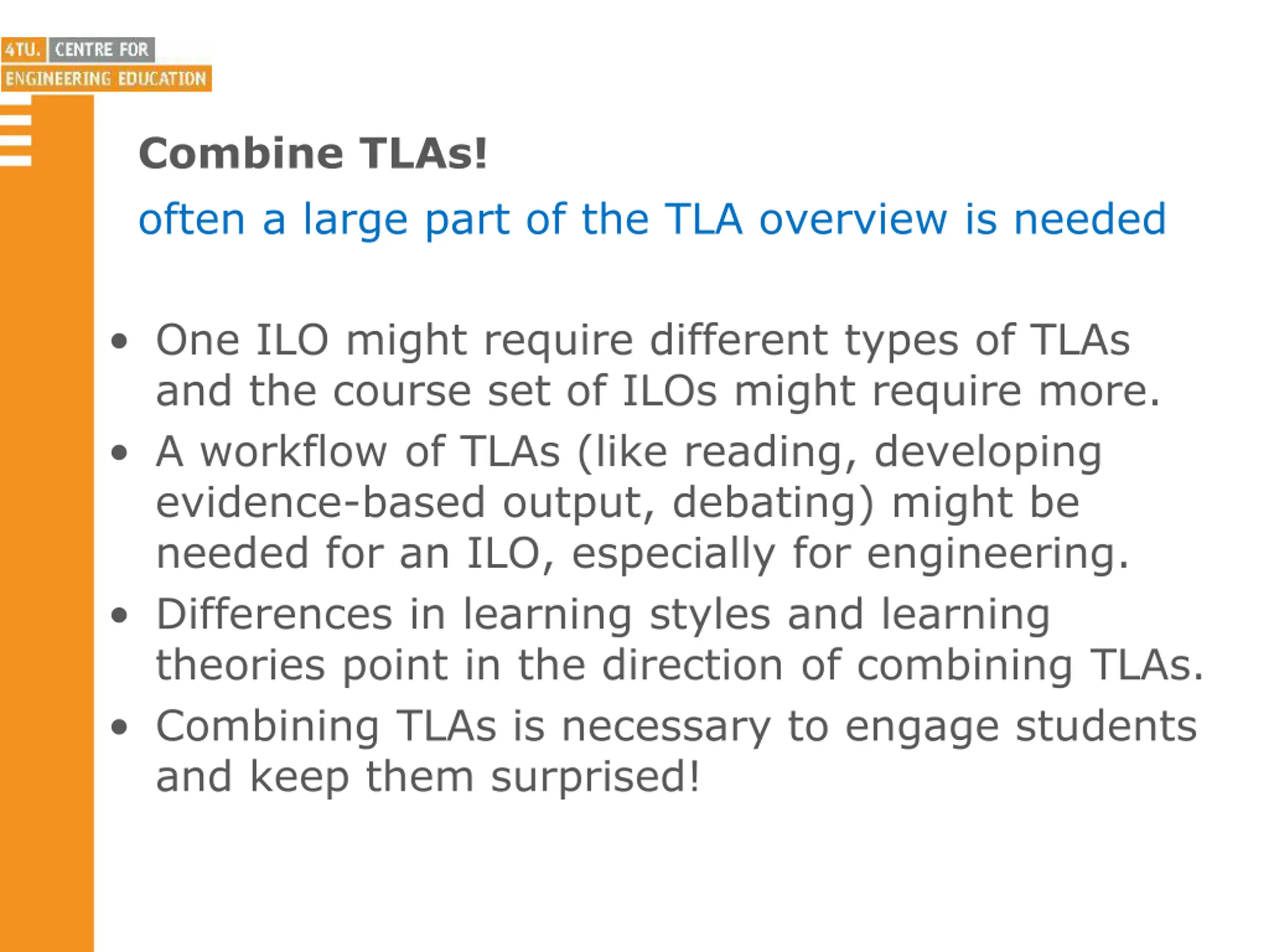 Combine TLAs! often a large part of the TLA overview is needed One ILO might require different types of TLAs and the course set of ILOs might require more. A workflow of TLAs (like reading, developing evidence-based output, debating) might be needed for an ILO, especially for engineering. Differences in learning styles and learning theories point in the direction of combining TLAs. Combining TLAs is necessary to engage students and keep them surprised!