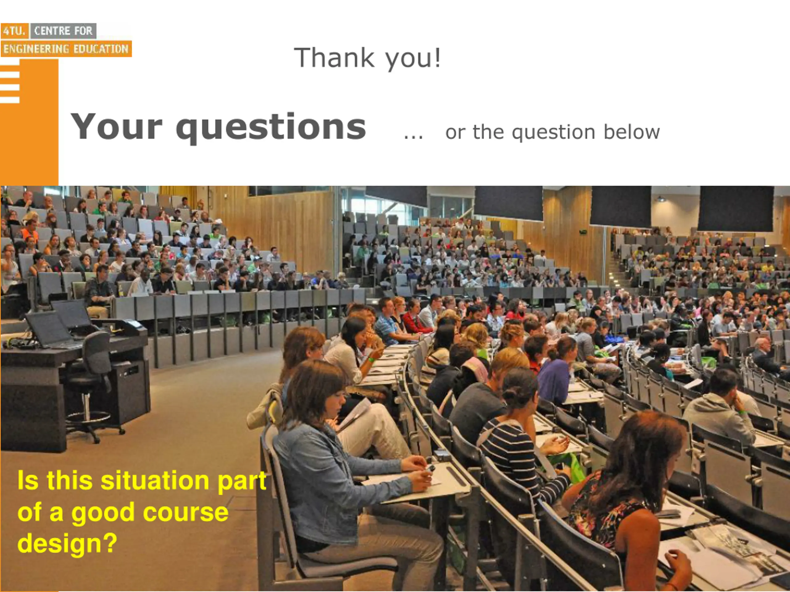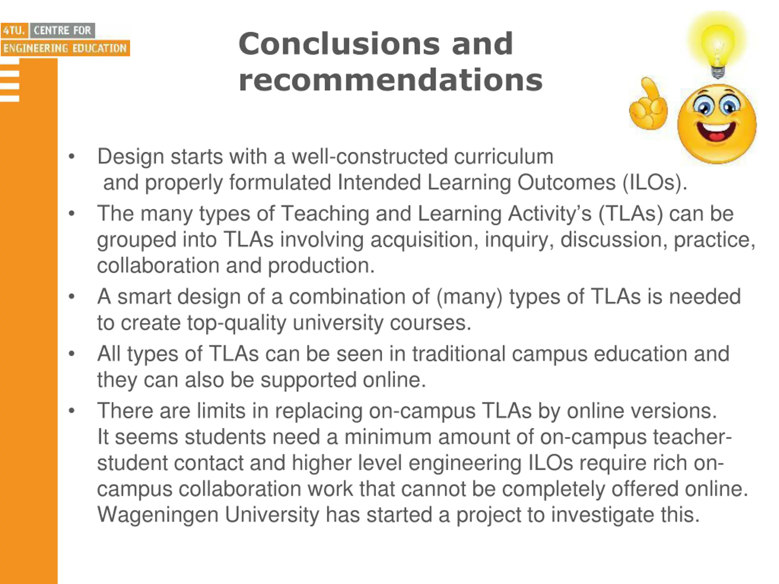 Conclusions and recommendations Design starts with a well-constructed curriculum and properly formulated Intended Learning Outcomes (ILOs). The many types of Teaching and Learning Activity s (TLAs) can be grouped into TLAs involving acquisition, inquiry, discussion, practice, collaboration and production. A smart design of a combination of (many) types of TLAs is needed to create top-quality university courses. All types of TLAs can be seen in traditional campus education and they can also be supported online. There are limits in replacing on-campus TLAs by online versions. It seems students need a minimum amount of on-campus teacher- student contact and higher level engineering ILOs require rich on- campus collaboration work that cannot be completely offered online. Wageningen University has started a project to investigate this.