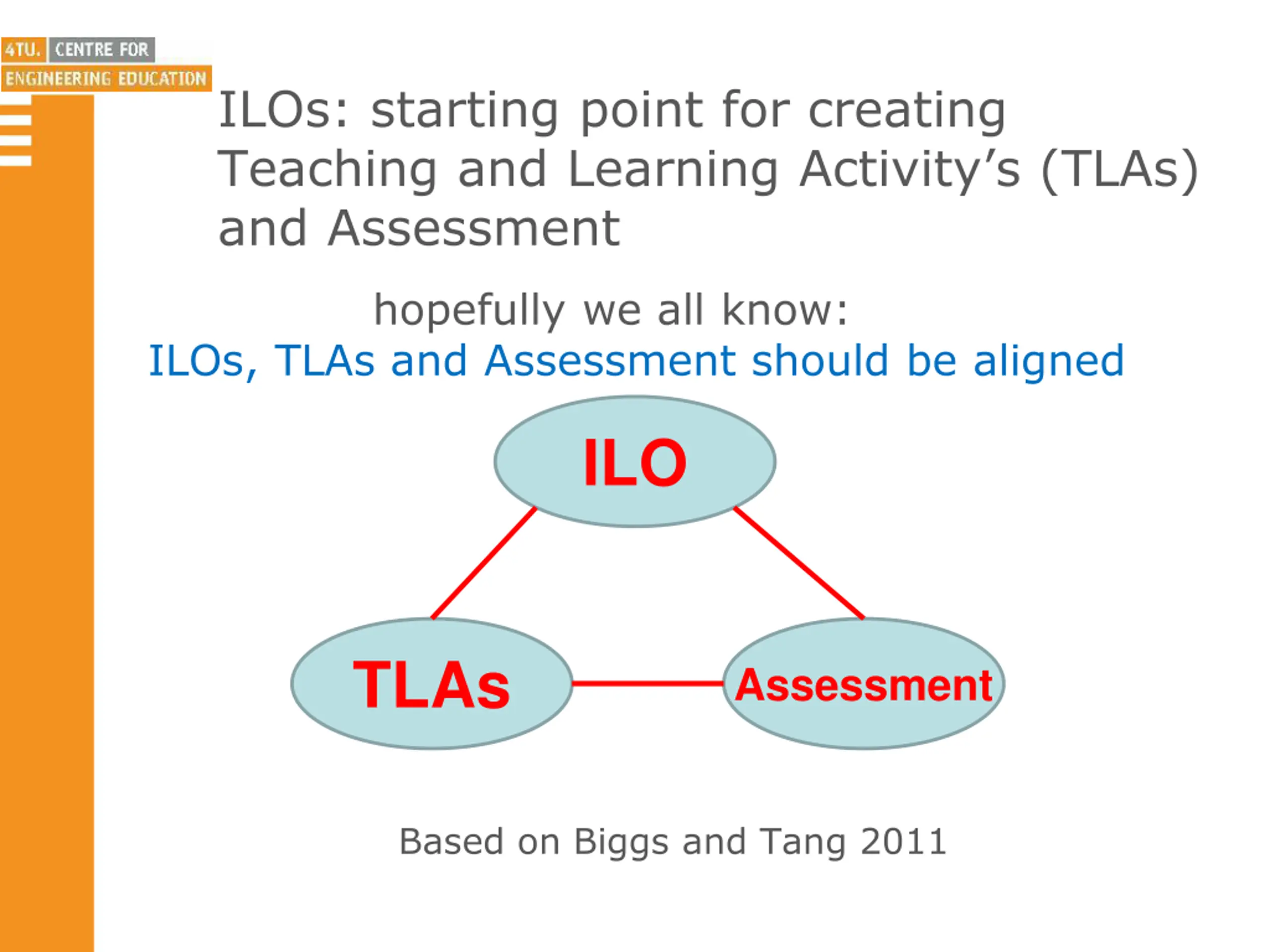 ILOs: starting point for creating Teaching and Learning Activity s (TLAs) and Assessment hopefully we all know: ILOs, TLAs and Assessment should be aligned ILO TLAs Assessment Based on Biggs and Tang 2011