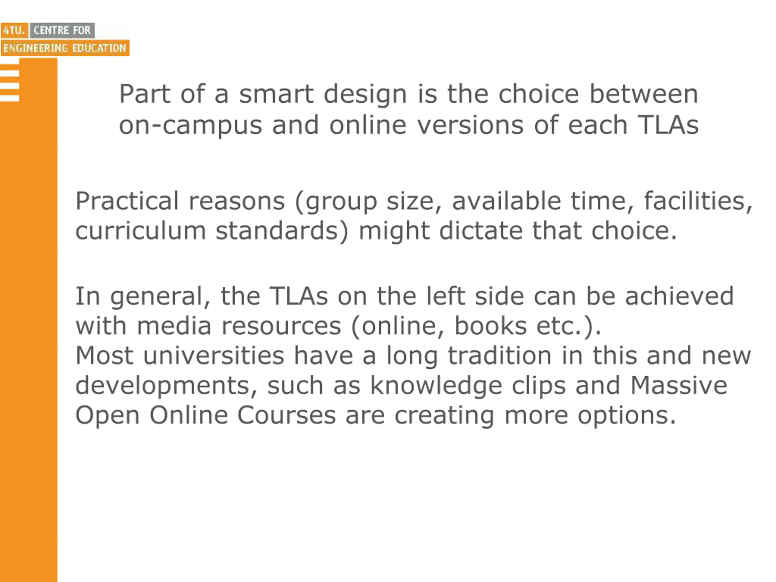 Part of a smart design is the choice between on-campus and online versions of each TLAs Practical reasons (group size, available time, facilities, curriculum standards) might dictate that choice. In general, the TLAs on the left side can be achieved with media resources (online, books etc.). Most universities have a long tradition in this and new developments, such as knowledge clips and Massive Open Online Courses are creating more options.