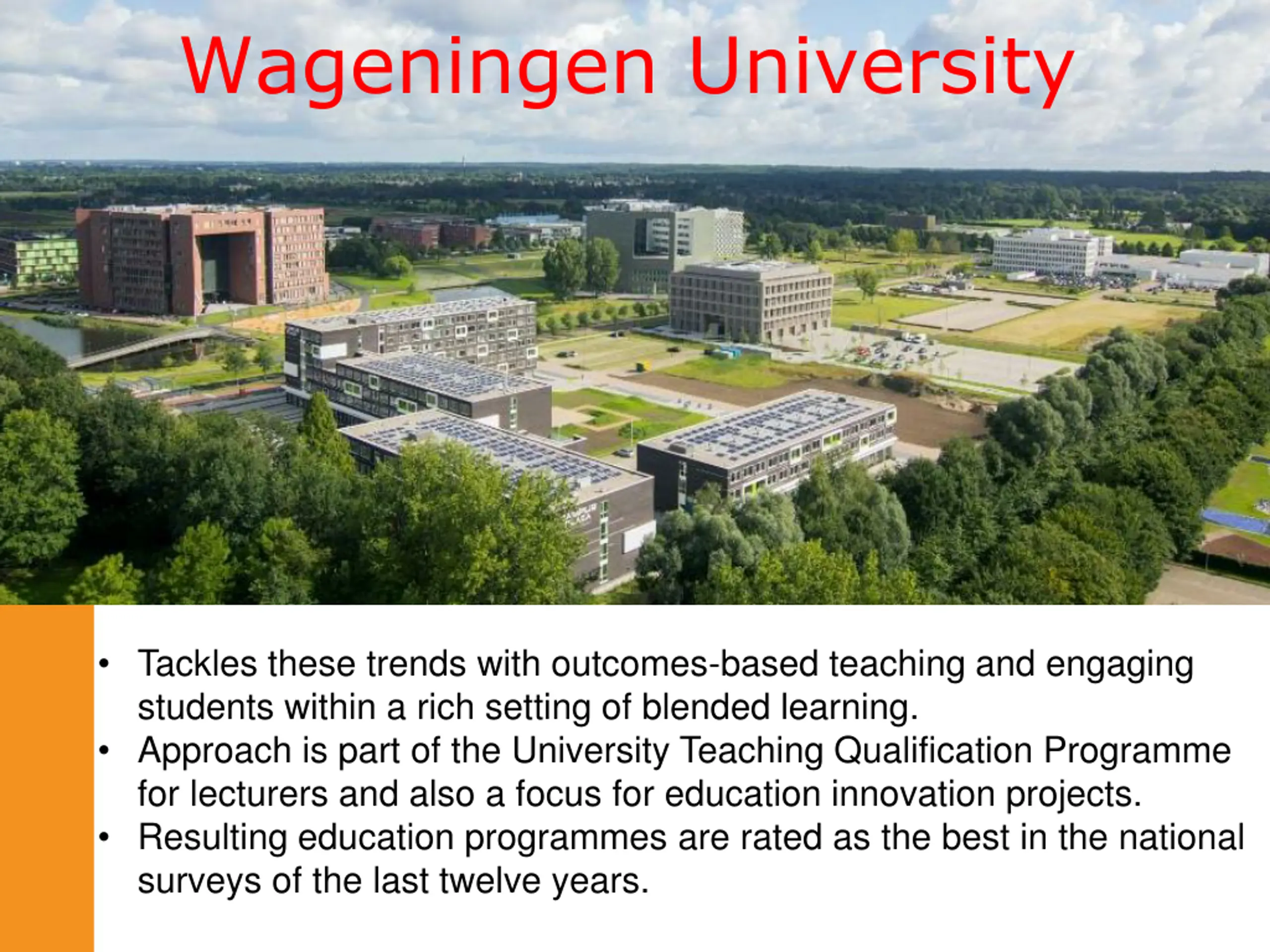 Wageningen University Tackles these trends with outcomes-based teaching and engaging students within a rich setting of blended learning. Approach is part of the University Teaching Qualification Programme for lecturers and also a focus for education innovation projects. Resulting education programmes are rated as the best in the national surveys of the last twelve years.