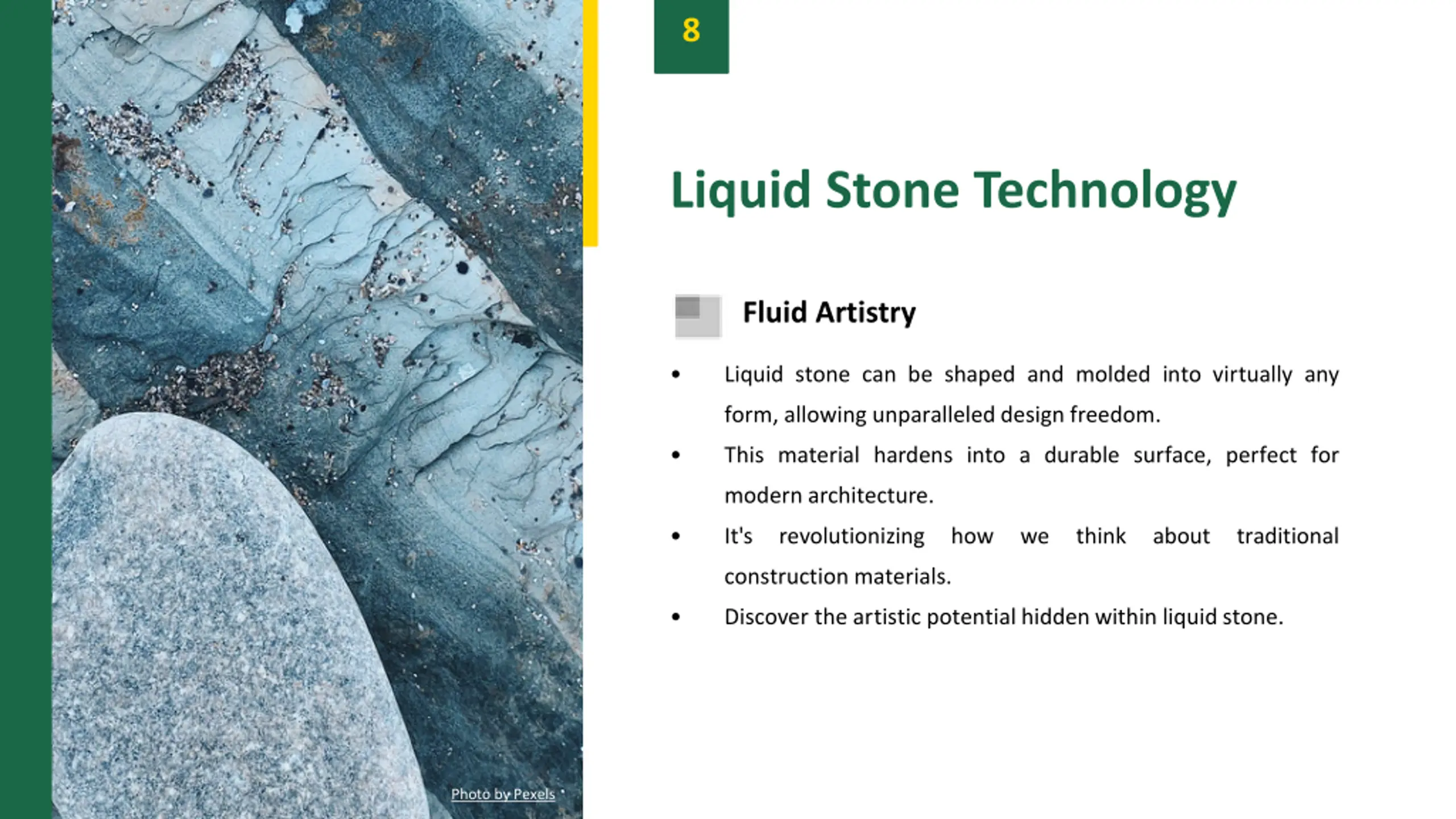 8 Liquid Stone Technology Fluid Artistry Liquid stone can be shaped and molded into virtually any form, allowing unparalleleddesign freedom. This material hardens into a durable surface, perfect for modern architecture. It's revolutionizing how we think about traditional construction materials. Discover the artistic potential hiddenwithin liquid stone. Photo by Pexels