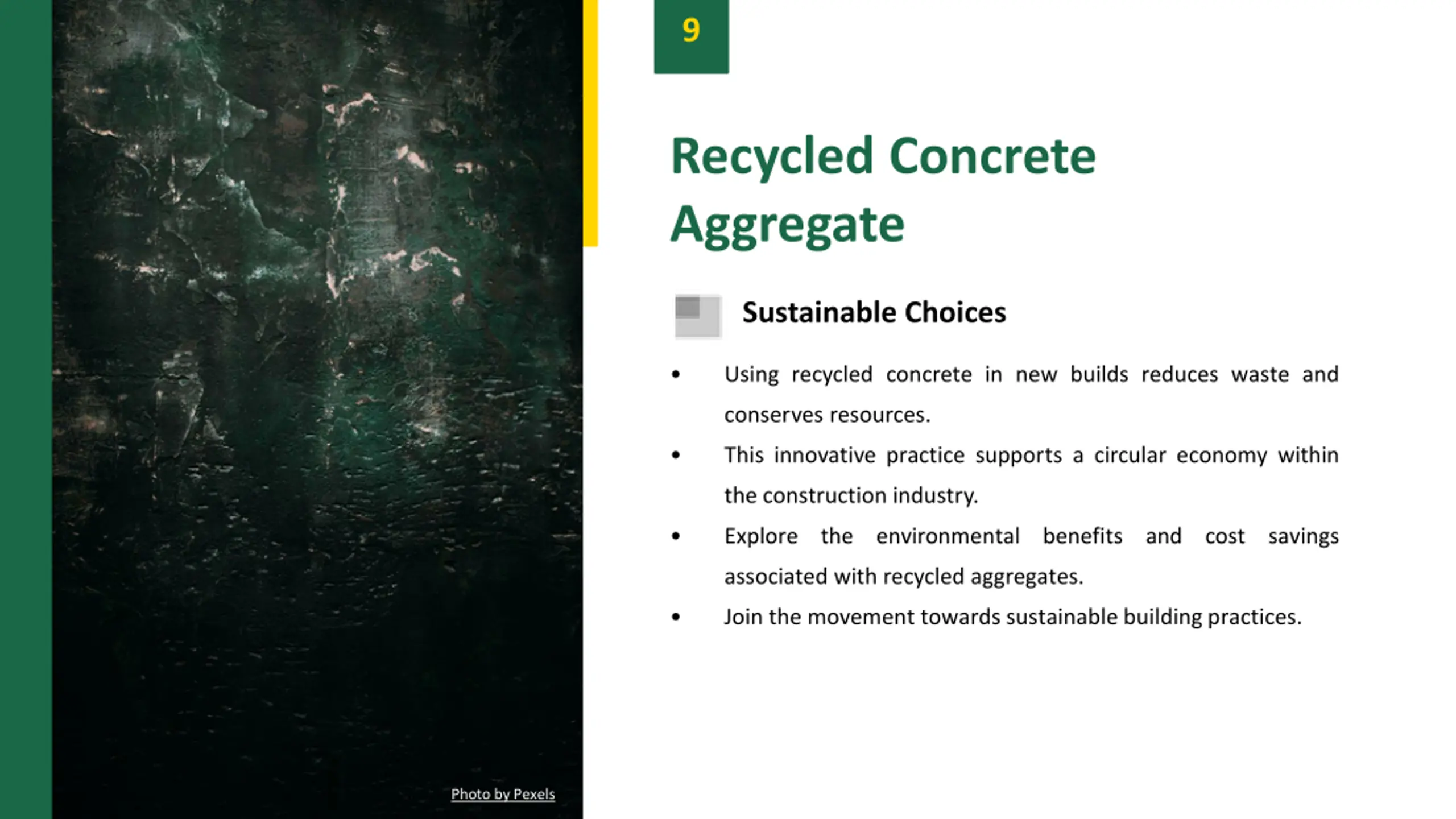 9 Recycled Concrete Aggregate Sustainable Choices Using recycled concrete in new builds reduces waste and conserves resources. This innovative practice supports a circular economy within the construction industry. Explore the environmental benefits and cost savings associated with recycled aggregates. Join the movement towards sustainable building practices. Photo by Pexels