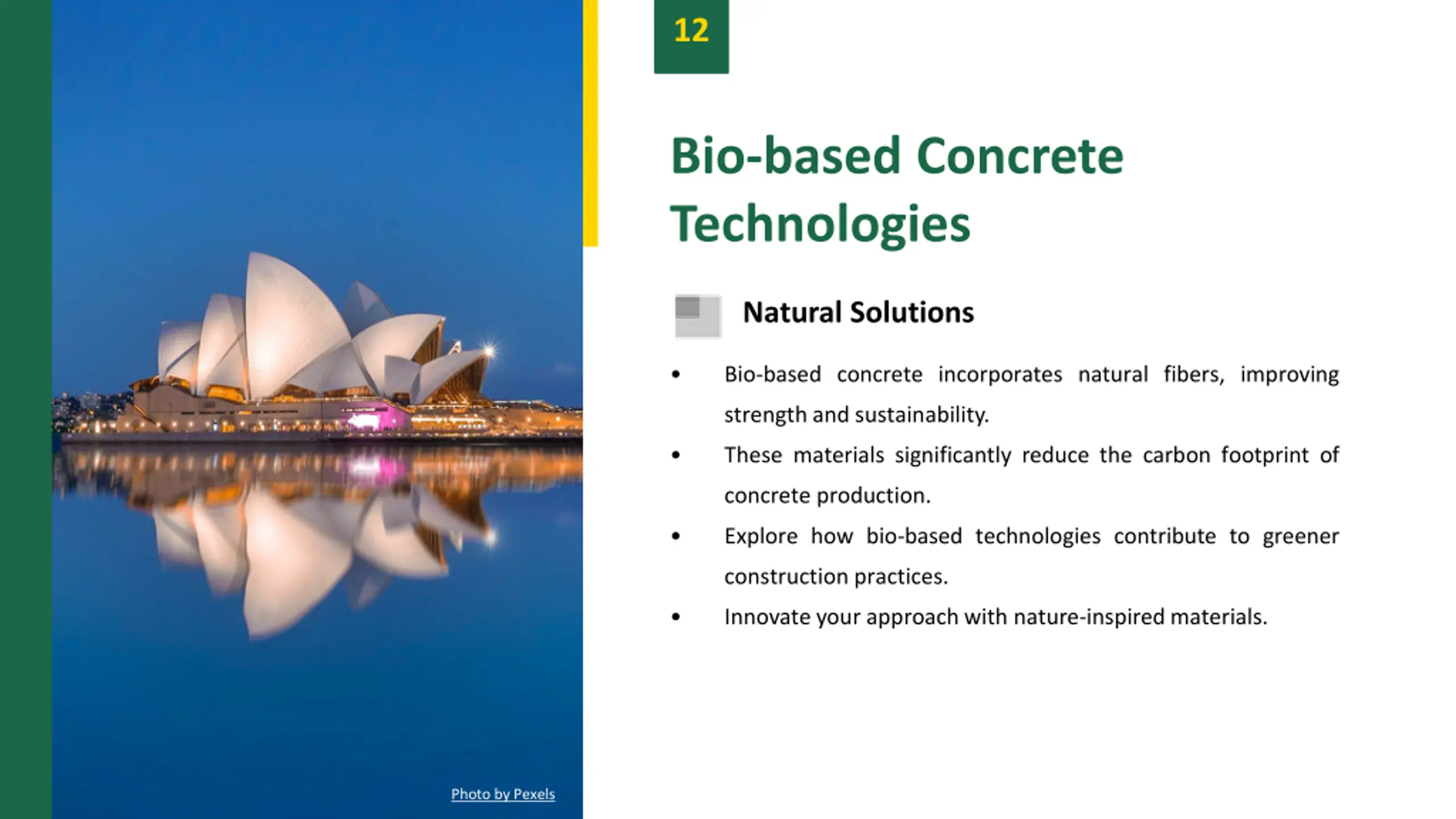 12 Bio-based Concrete Technologies Natural Solutions Bio-based concrete incorporates natural fibers, improving strengthand sustainability. These materials significantly reduce the carbon footprint of concrete production. Explore how bio-based technologies contribute to greener construction practices. Innovate your approach with nature-inspired materials. Photo by Pexels