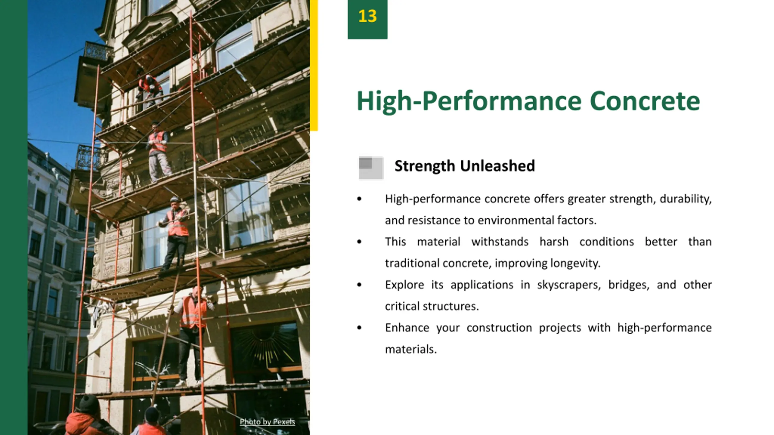 13 High-Performance Concrete Strength Unleashed High-performance concrete offers greater strength, durability, and resistance to environmental factors. This material withstands harsh conditions better than traditional concrete, improving longevity. Explore its applications in skyscrapers, bridges, and other critical structures. Enhance your construction projects with high-performance materials. Photo by Pexels
