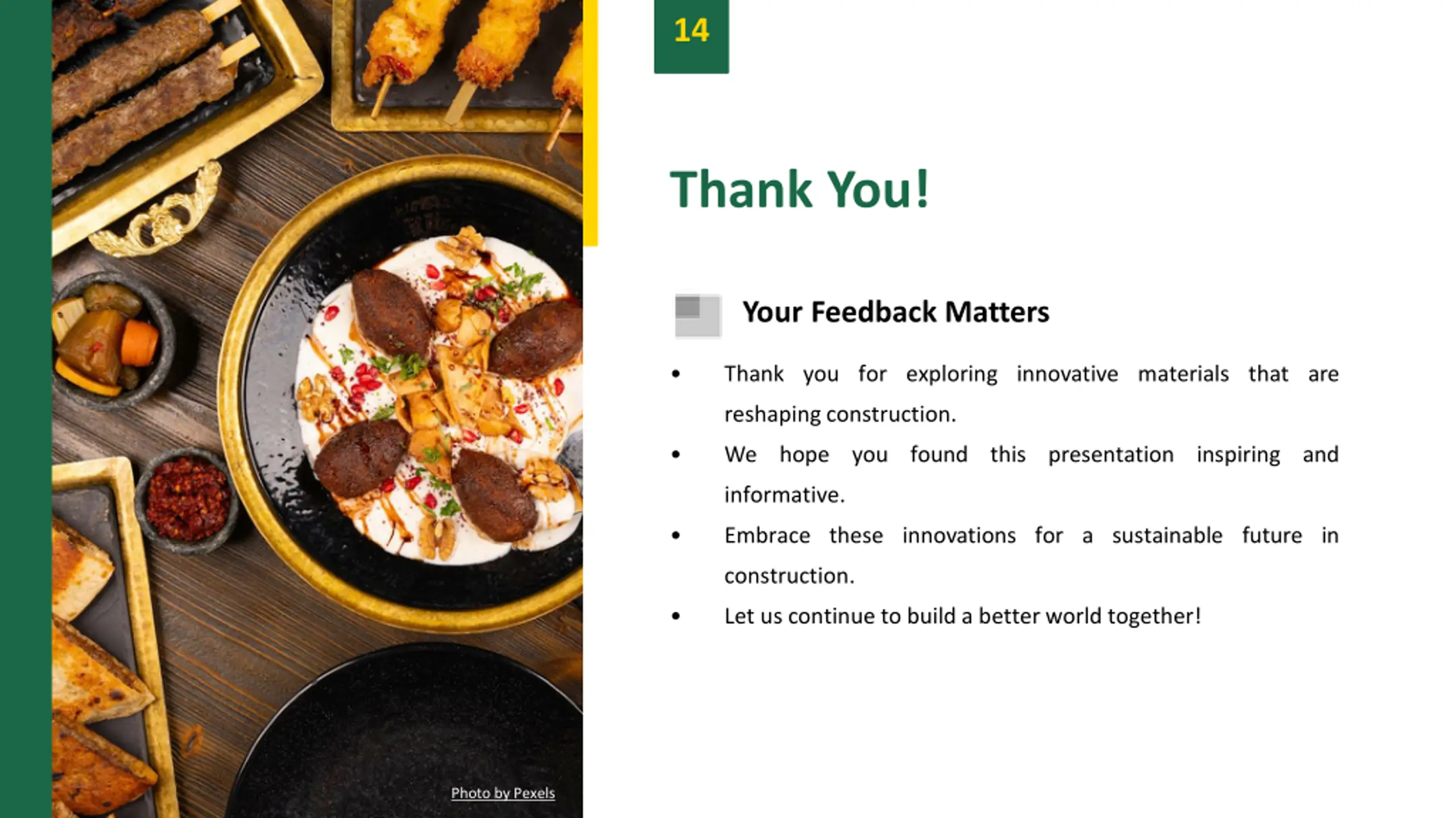 14 Thank You! Your Feedback Matters Thank you for exploring innovative materials that are reshapingconstruction. We hope you found this presentation inspiring and informative. Embrace these innovations for a sustainable future in construction. Let us continue to build a better world together! Photo by Pexels