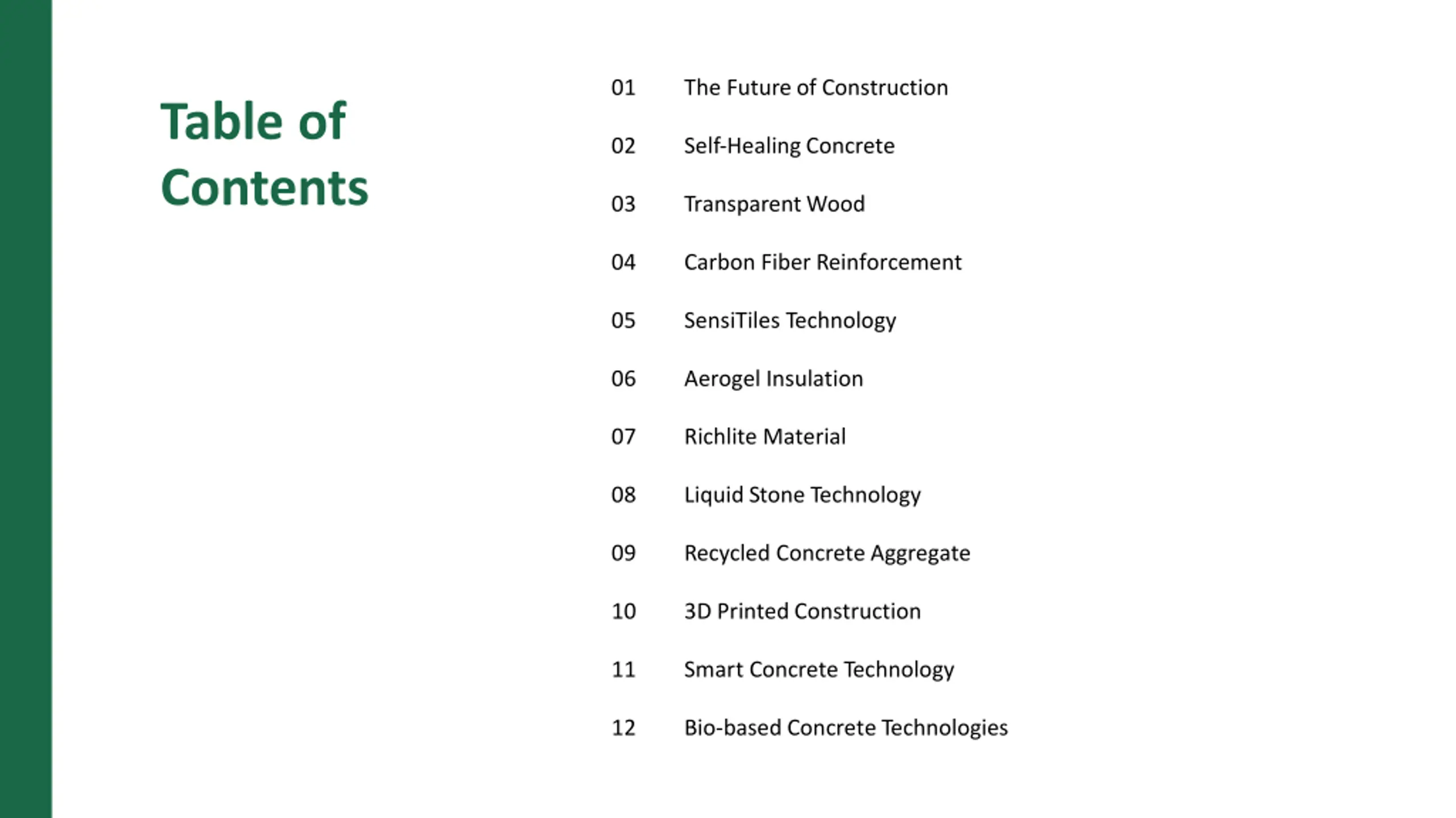 01 The Future of Construction Table of Contents 02 Self-Healing Concrete 03 Transparent Wood 04 Carbon Fiber Reinforcement 05 SensiTiles Technology 06 Aerogel Insulation 07 Richlite Material 08 Liquid Stone Technology 09 Recycled Concrete Aggregate 10 3D Printed Construction 11 Smart Concrete Technology 12 Bio-based Concrete Technologies