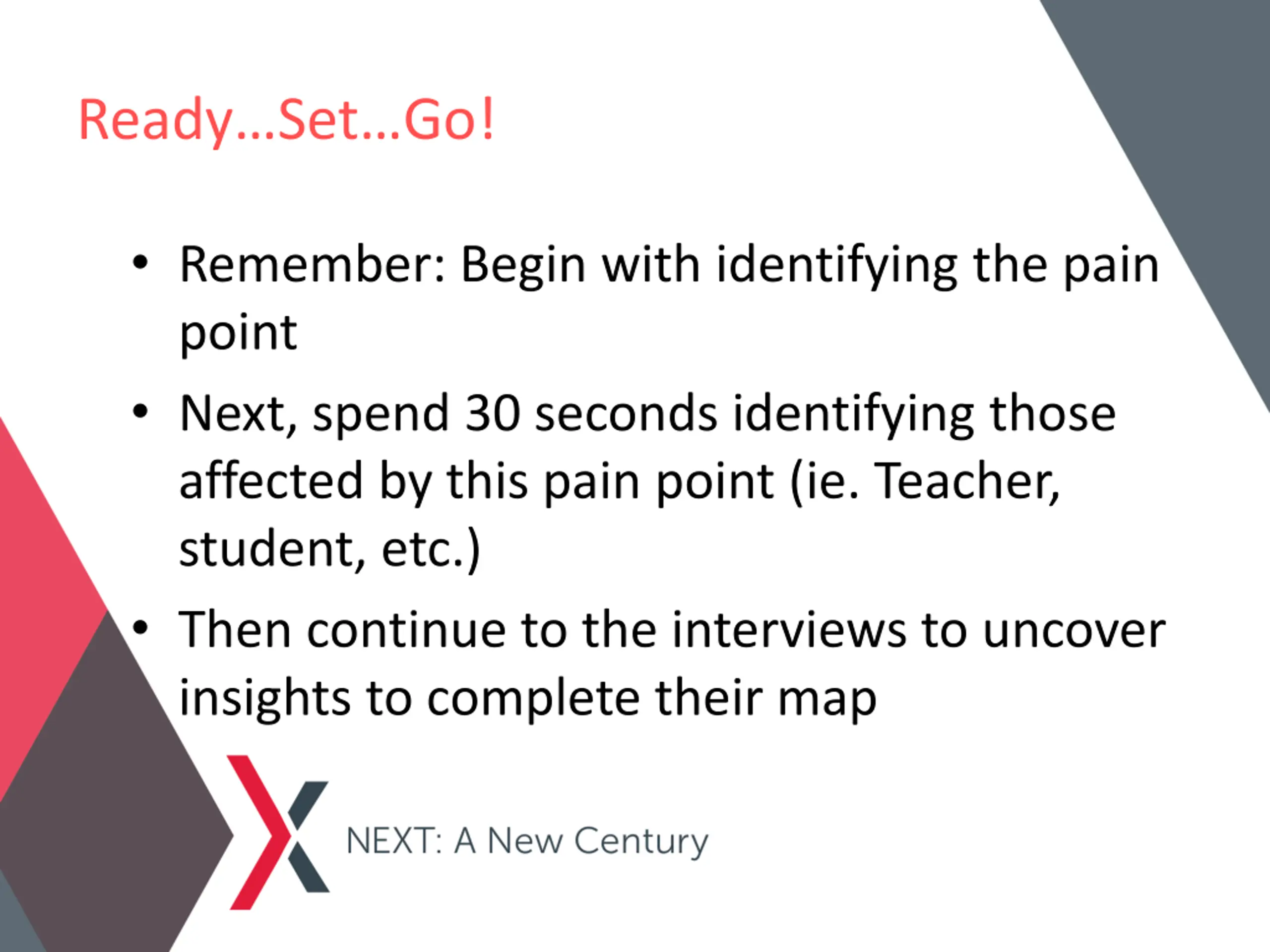 ReadySetGo! Remember: Begin with identifying the pain point Next, spend 30 seconds identifying those affected by this pain point (ie. Teacher, student, etc.) Then continue to the interviews to uncover insights to complete their map