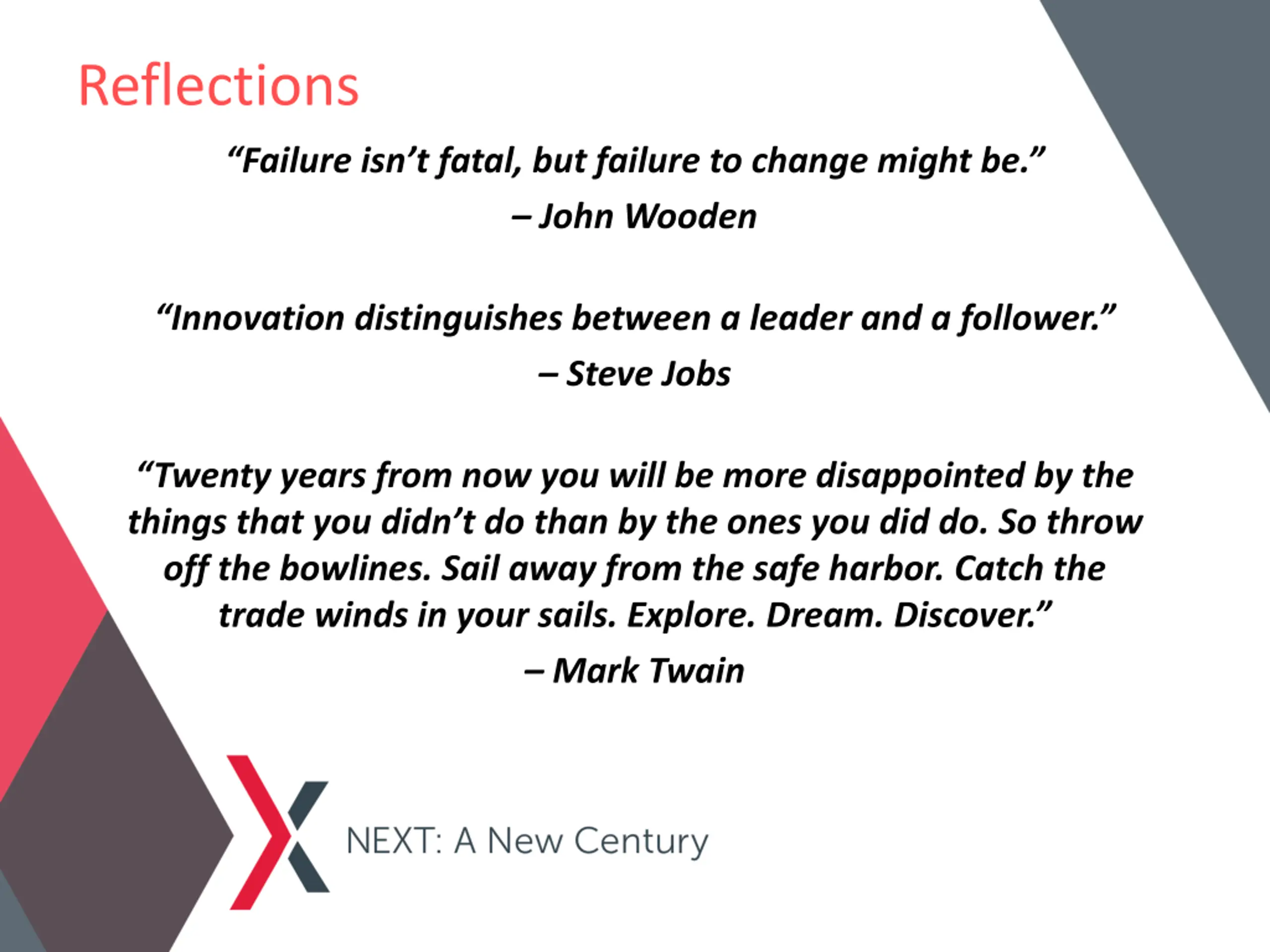 Reflections Failure isn t fatal, but failure to change might be. John Wooden Innovation distinguishes between a leader and a follower. Steve Jobs Twenty years from now you will be more disappointed by the things that you didn t do than by the ones you did do. So throw off the bowlines. Sail away from the safe harbor. Catch the trade winds in your sails. Explore. Dream. Discover. Mark Twain
