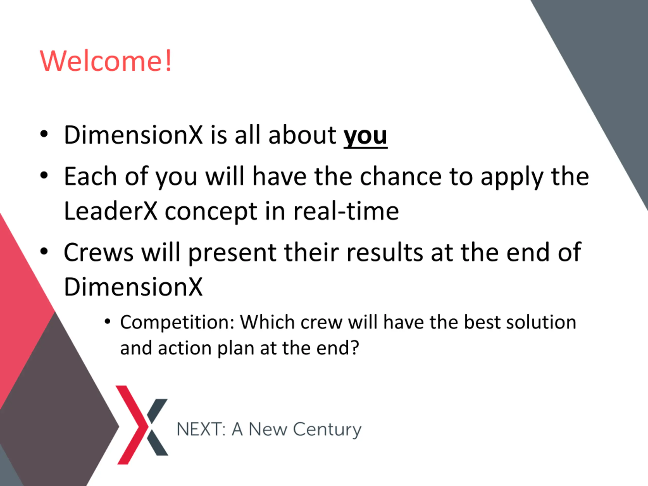 Welcome! DimensionX is all about you Each of you will have the chance to apply the LeaderX concept in real-time Crews will present their results at the end of DimensionX Competition: Which crew will have the best solution and action plan at the end?