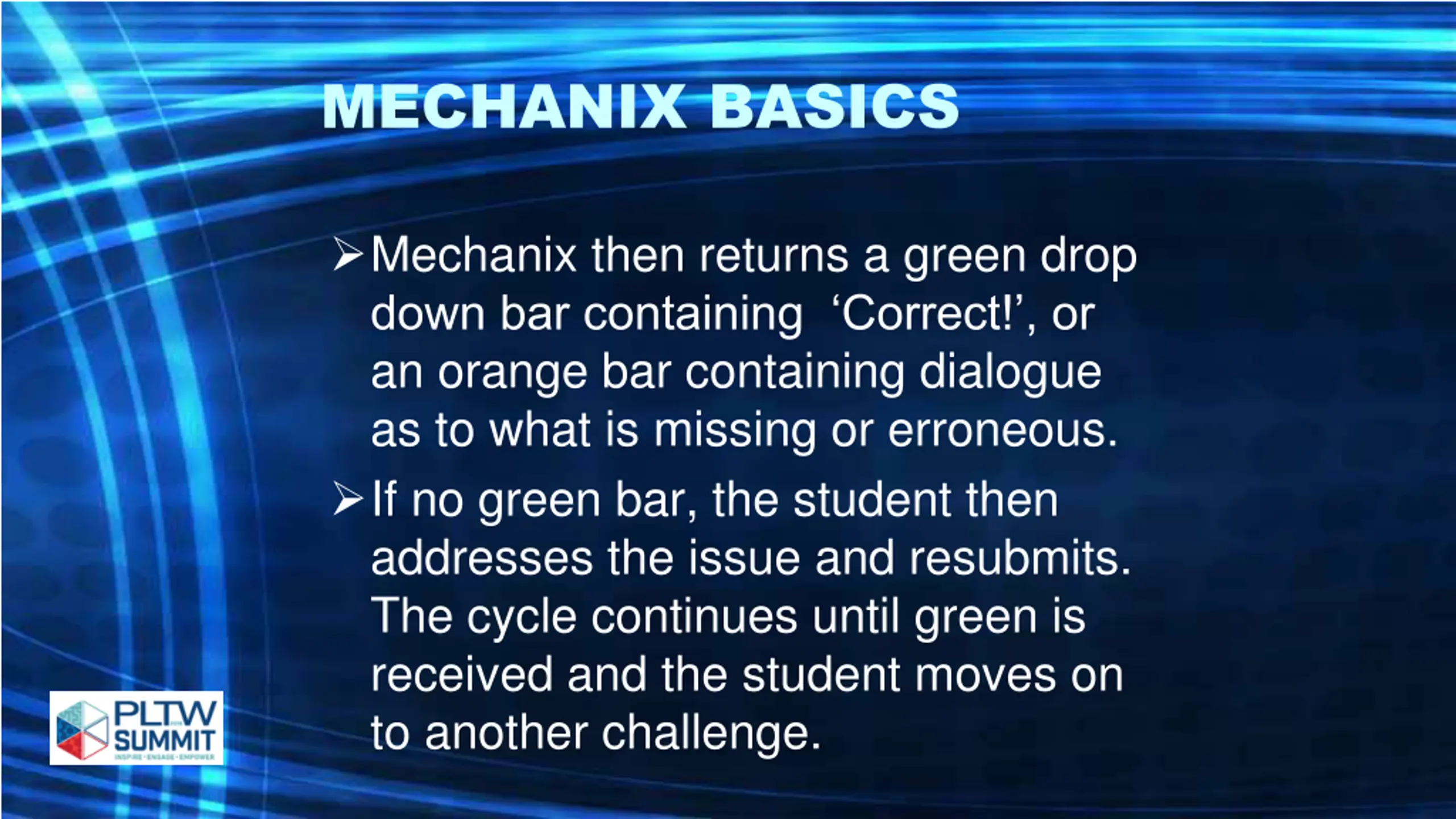 MECHANIX BASICS Mechanix then returns a green drop down bar containing Correct! , or an orange bar containing dialogue as to what is missing or erroneous. If no green bar, the student then addresses the issue and resubmits. The cycle continues until green is received and the student moves on to another challenge.