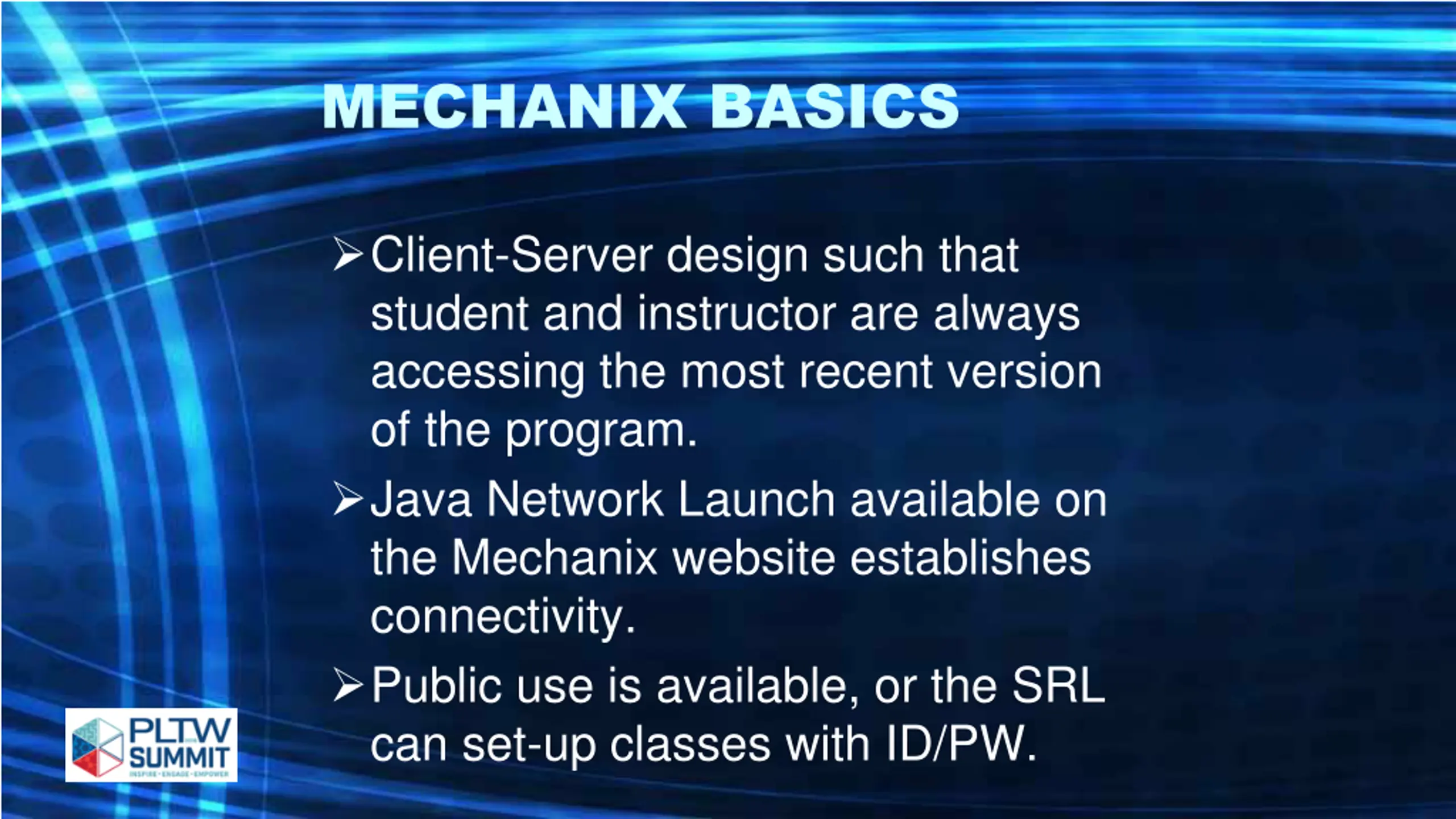 MECHANIX BASICS Client-Server design such that student and instructor are always accessing the most recent version of the program. Java Network Launch available on the Mechanix website establishes connectivity. Public use is available, or the SRL can set-up classes with ID/PW.