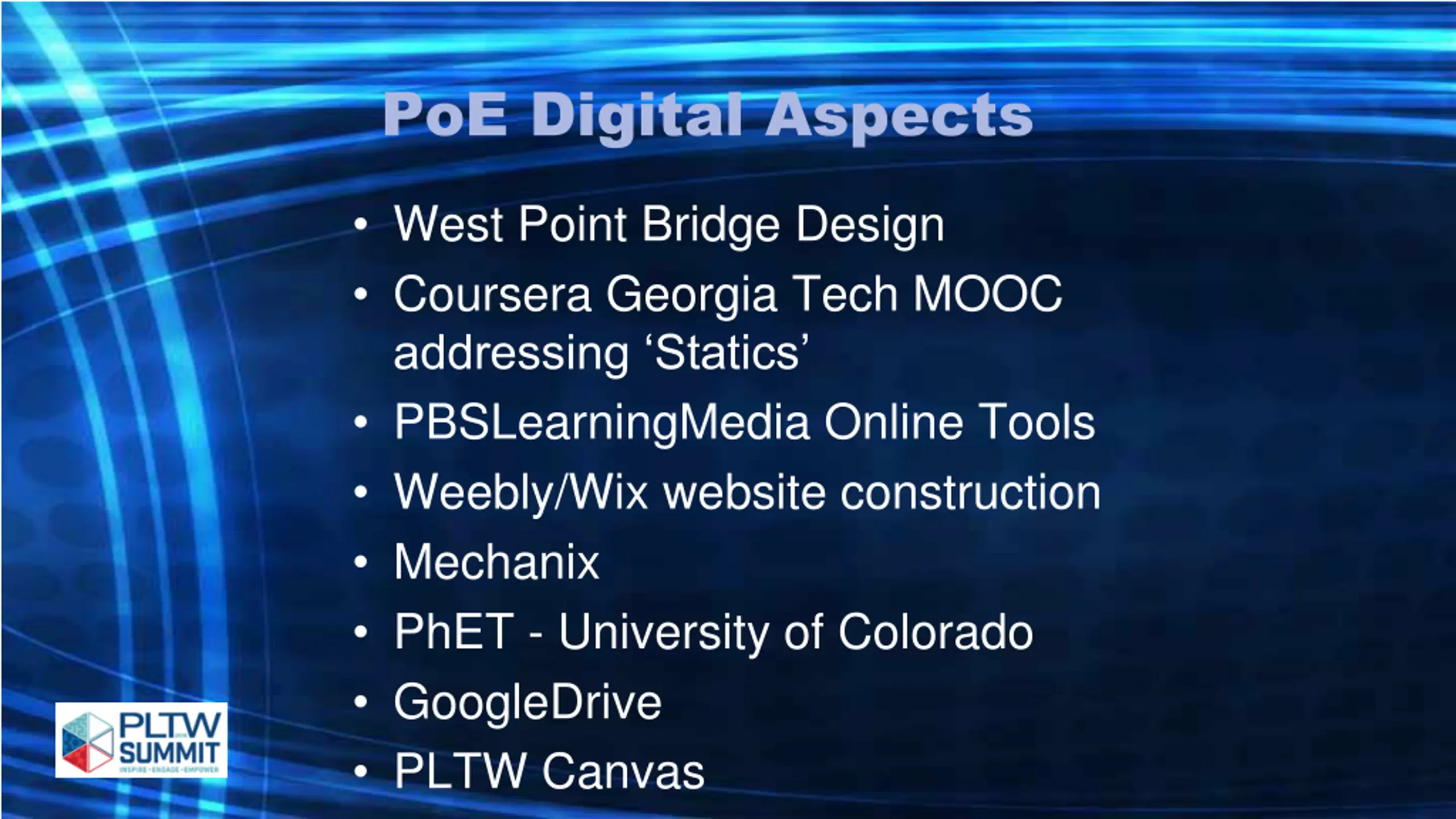 PoE Digital Aspects West Point Bridge Design Coursera Georgia Tech MOOC addressing Statics PBSLearningMedia Online Tools Weebly/Wix website construction Mechanix PhET - University of Colorado GoogleDrive PLTW Canvas