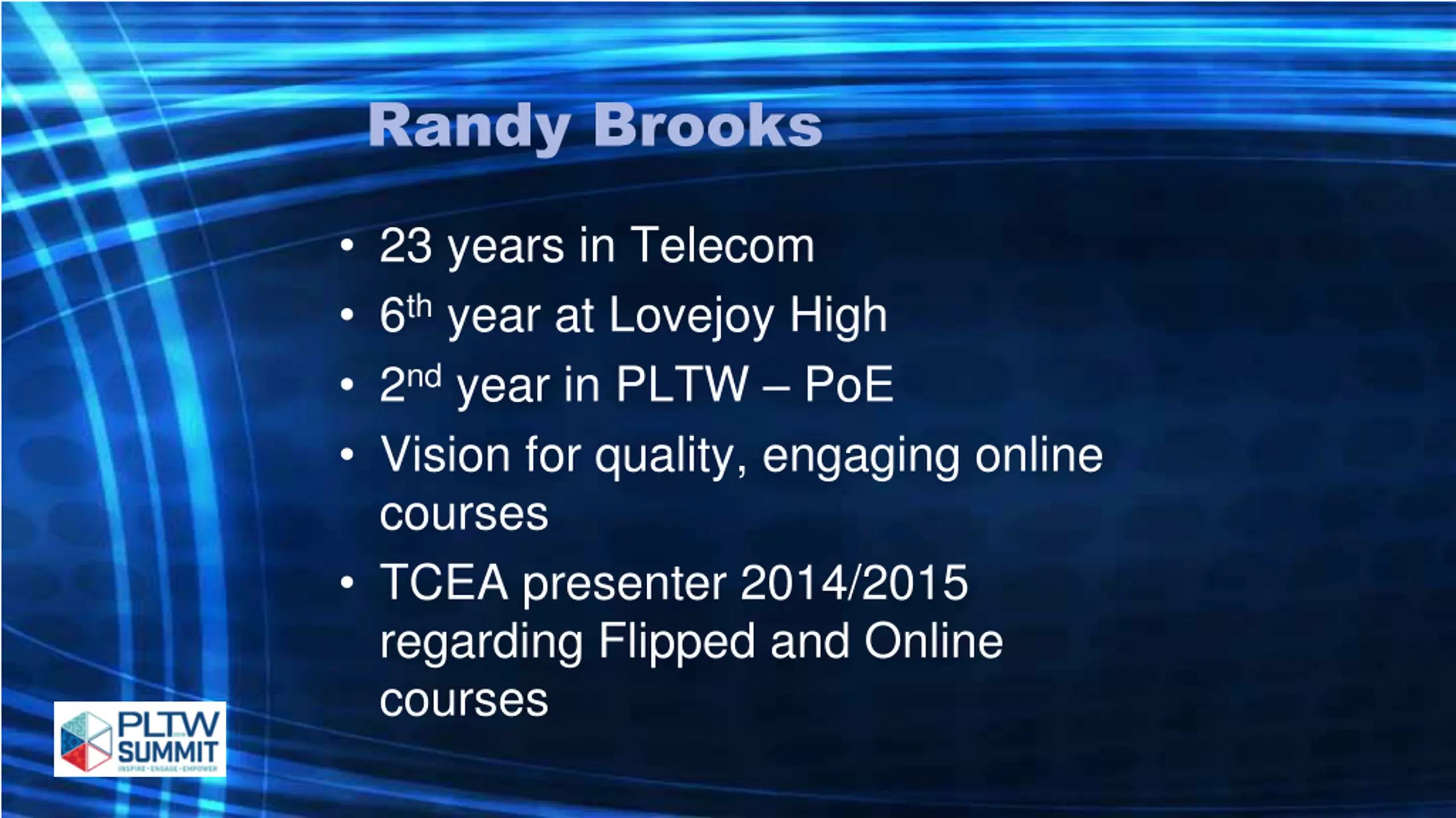 Randy Brooks 23 years in Telecom 6thyear at Lovejoy High 2ndyear in PLTW PoE Vision for quality, engaging online courses TCEA presenter 2014/2015 regarding Flipped and Online courses