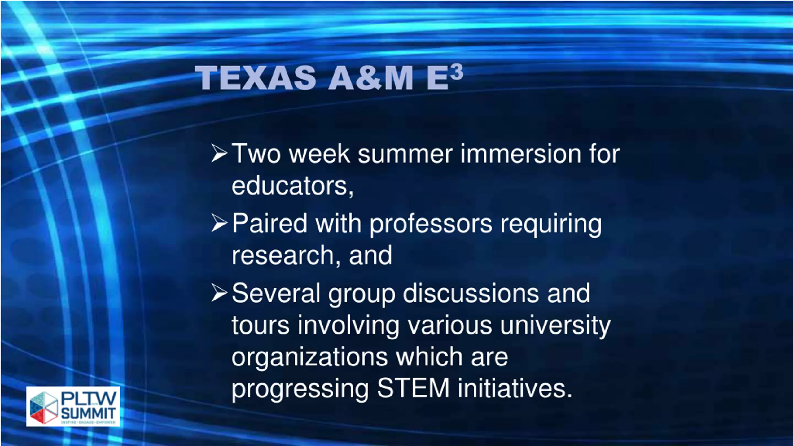 TEXAS A&M E3 Two week summer immersion for educators, Paired with professors requiring research, and Several group discussions and tours involving various university organizations which are progressing STEM initiatives.