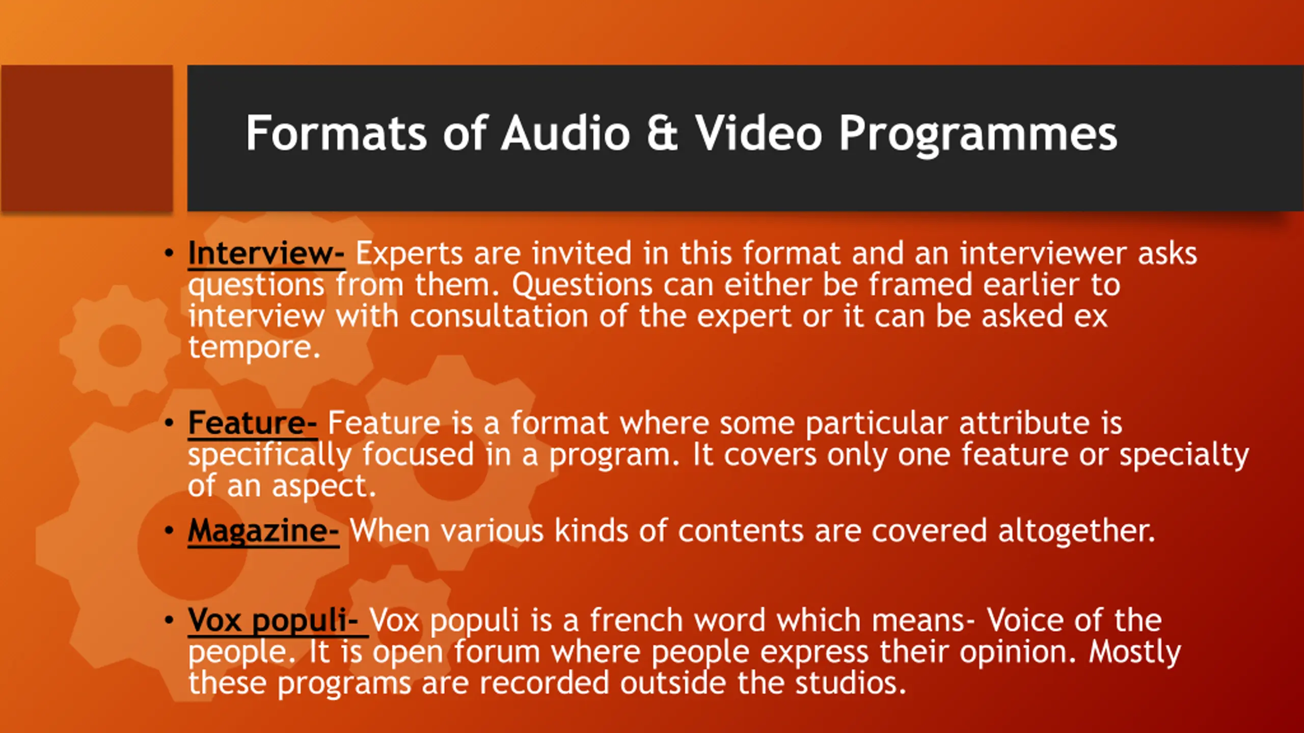 Formats of Audio & Video Programmes Interview- Experts are invited in this format and an interviewer asks questions from them. Questions can either be framed earlier to interview with consultation of the expert or it can be asked ex tempore. Feature- Feature is a format where some particular attribute is specifically focused in a program. It covers only one feature or specialty of an aspect. Magazine- When various kinds of contents are covered altogether. Vox populi- Vox populi is a french word which means- Voice of the people. It is open forum where people express their opinion. Mostly these programs are recorded outside the studios.