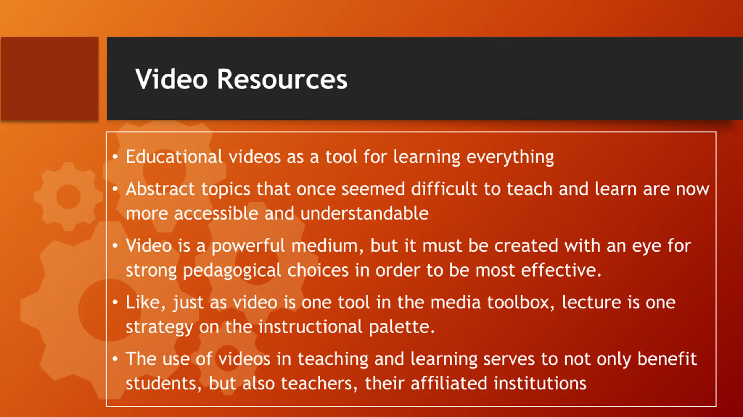Video Resources Educational videos as a tool for learning everything Abstract topics that once seemed difficult to teach and learn are now more accessible and understandable Video is a powerful medium, but it must be created with an eye for strong pedagogical choices in order to be most effective. Like, just as video is one tool in the media toolbox, lecture is one strategy on the instructional palette. The use of videos in teaching and learning serves to not only benefit students, but also teachers, their affiliated institutions