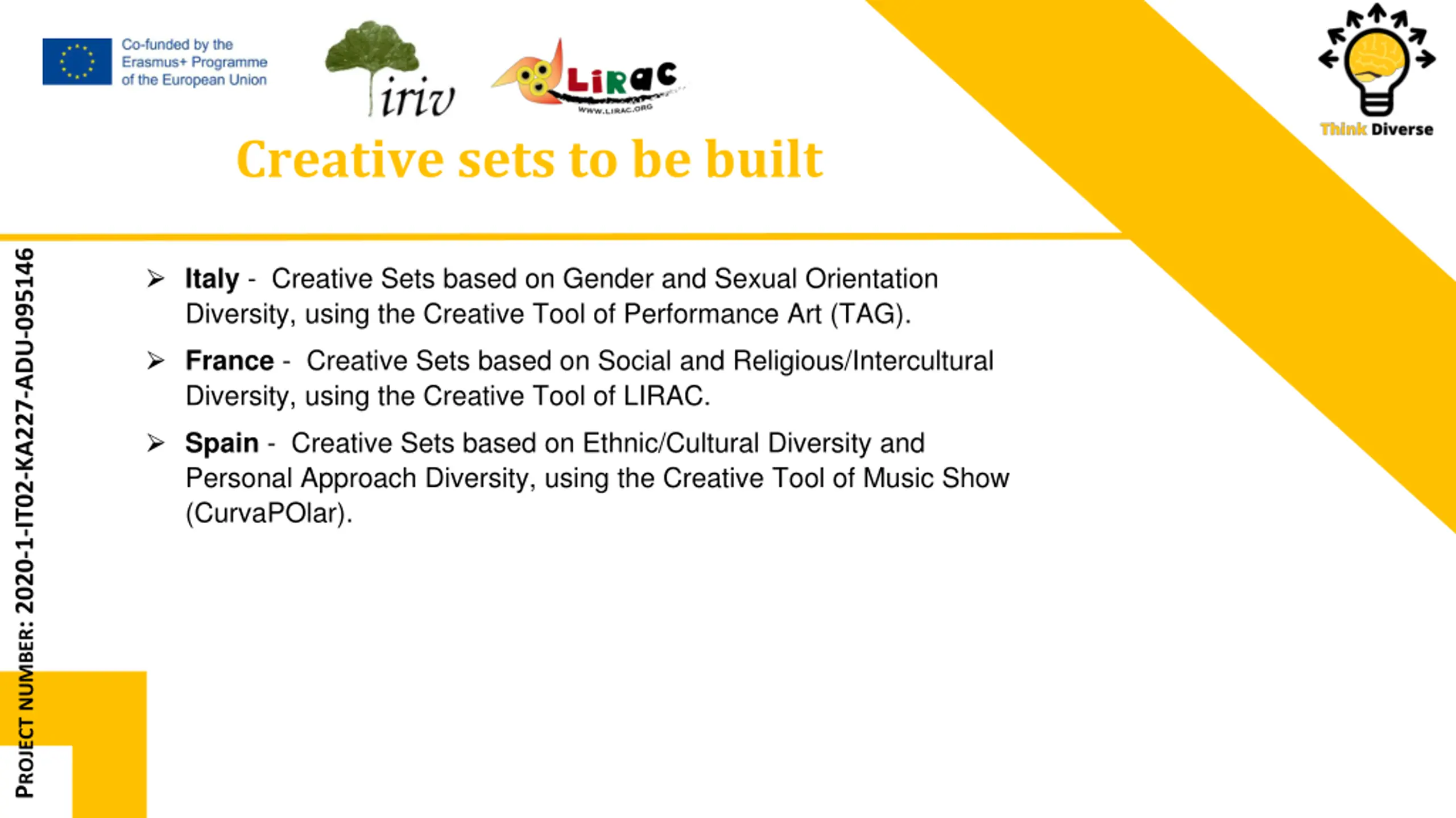 Creative sets to be built PROJECT NUMBER: 2020-1-IT02-KA227-ADU-095146 Italy - Creative Sets based on Gender and Sexual Orientation Diversity, using the Creative Tool of Performance Art (TAG). France - Creative Sets based on Social and Religious/Intercultural Diversity, using the Creative Tool of LIRAC. Spain - Creative Sets based on Ethnic/Cultural Diversity and Personal Approach Diversity, using the Creative Tool of Music Show (CurvaPOlar).