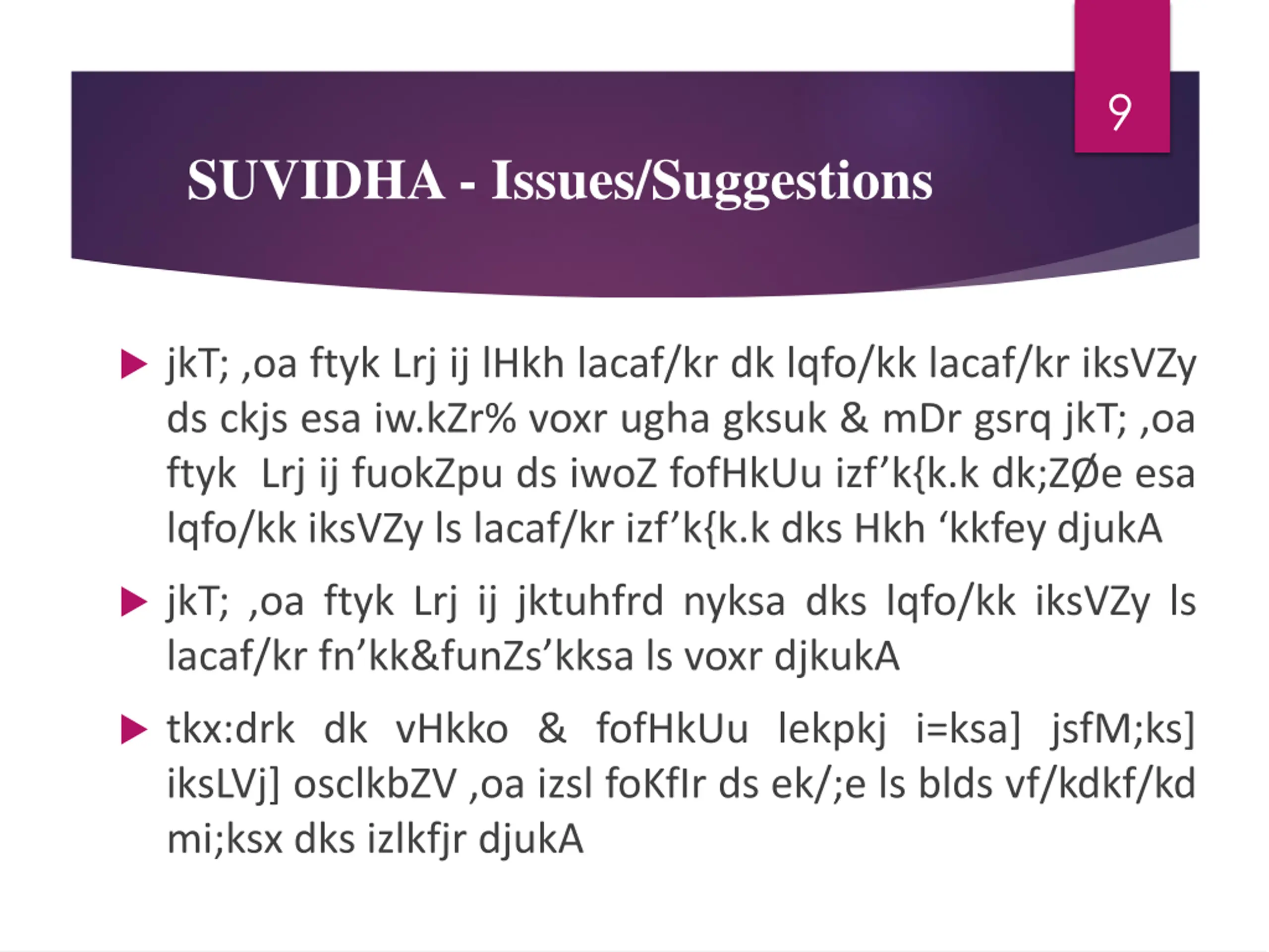 9 SUVIDHA - Issues/Suggestions jkT; ,oa ftyk Lrj ij lHkh lacaf/kr dk lqfo/kk lacaf/kr iksVZy ds ckjs esa iw.kZr% voxr ugha gksuk & mDr gsrq jkT; ,oa ftyk Lrj ij fuokZpu ds iwoZ fofHkUu izf k{k.k dk;Z e esa lqfo/kk iksVZy ls lacaf/kr izf k{k.k dks Hkh kkfey djukA jkT; ,oa ftyk Lrj ij jktuhfrd nyksa dks lqfo/kk iksVZy ls lacaf/kr fn kk&funZs kksa ls voxr djkukA tkx:drk dk vHkko & fofHkUu lekpkj i=ksa] jsfM;ks] iksLVj] osclkbZV ,oa izsl foKfIr ds ek/;e ls blds vf/kdkf/kd mi;ksx dks izlkfjr djukA