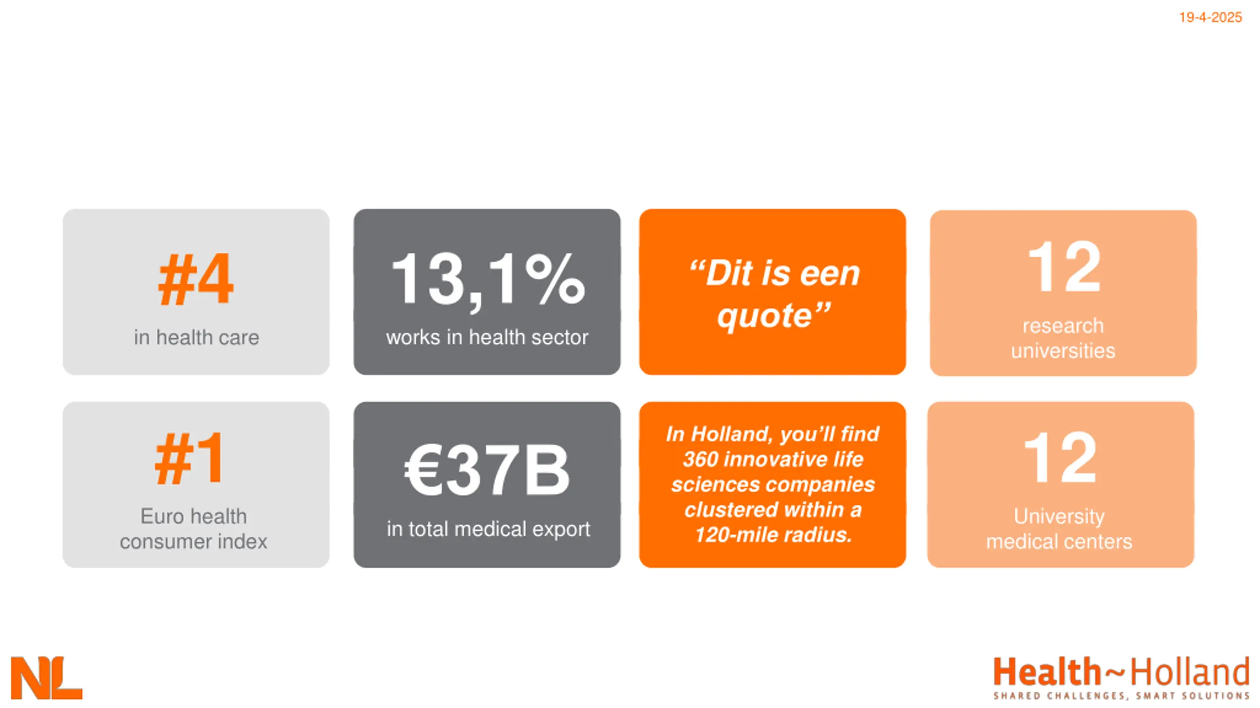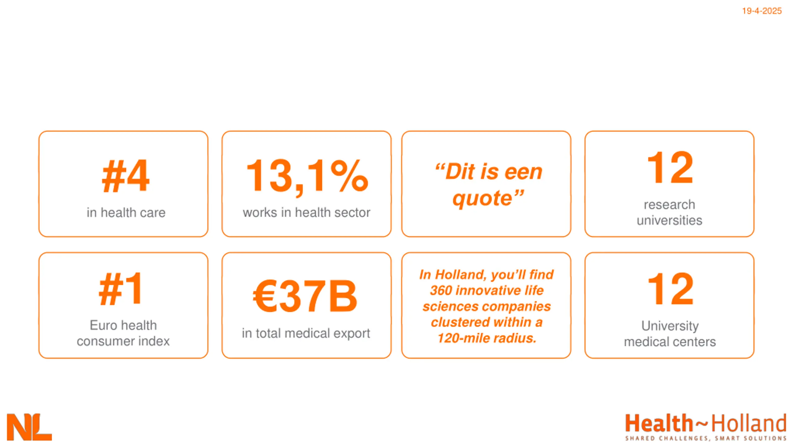 19-4-2025 12 research universities #4 in health care 13,1% works in health sector Dit is een quote #1 Euro health consumer index 12 University medical centers In Holland, you ll find 360 innovative life sciences companies clustered within a 120-mile radius. 37B in total medical export