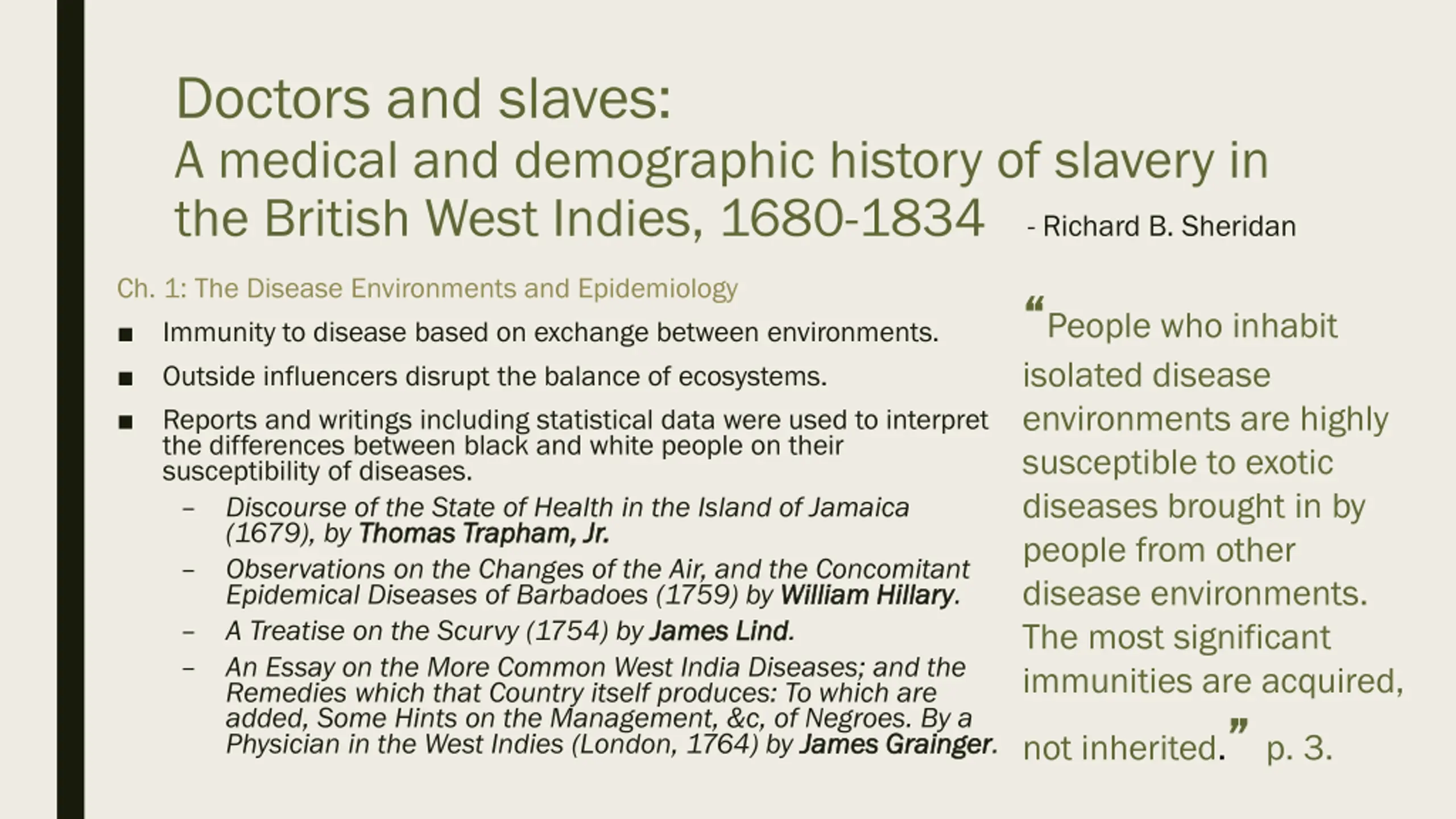 Doctors and slaves: A medical and demographic history of slavery in the British West Indies, 1680-1834 - Richard B. Sheridan Ch. 1: The Disease Environments and Epidemiology Immunity to disease based on exchange between environments. Outside influencers disrupt the balance of ecosystems. Reports and writings including statistical data were used to interpret the differences between black and white people on their susceptibility of diseases. Discourse of the State of Health in the Island of Jamaica (1679), by Thomas Thomas Trapham Trapham, Jr. Observations on the Changes of the Air, and the Concomitant Epidemical Diseases of Barbadoes (1759) by William Hillary A Treatise on the Scurvy (1754) by James Lind An Essay on the More Common West India Diseases; and the Remedies which that Country itself produces: To which are added, Some Hints on the Management, &c, of Negroes. By a Physician in the West Indies (London, 1764) by James Grainger People who inhabit isolated disease environments are highly susceptible to exotic diseases brought in by people from other disease environments. The most significant immunities are acquired, not inherited. p. 3. , Jr. William Hillary. James Lind. James Grainger.