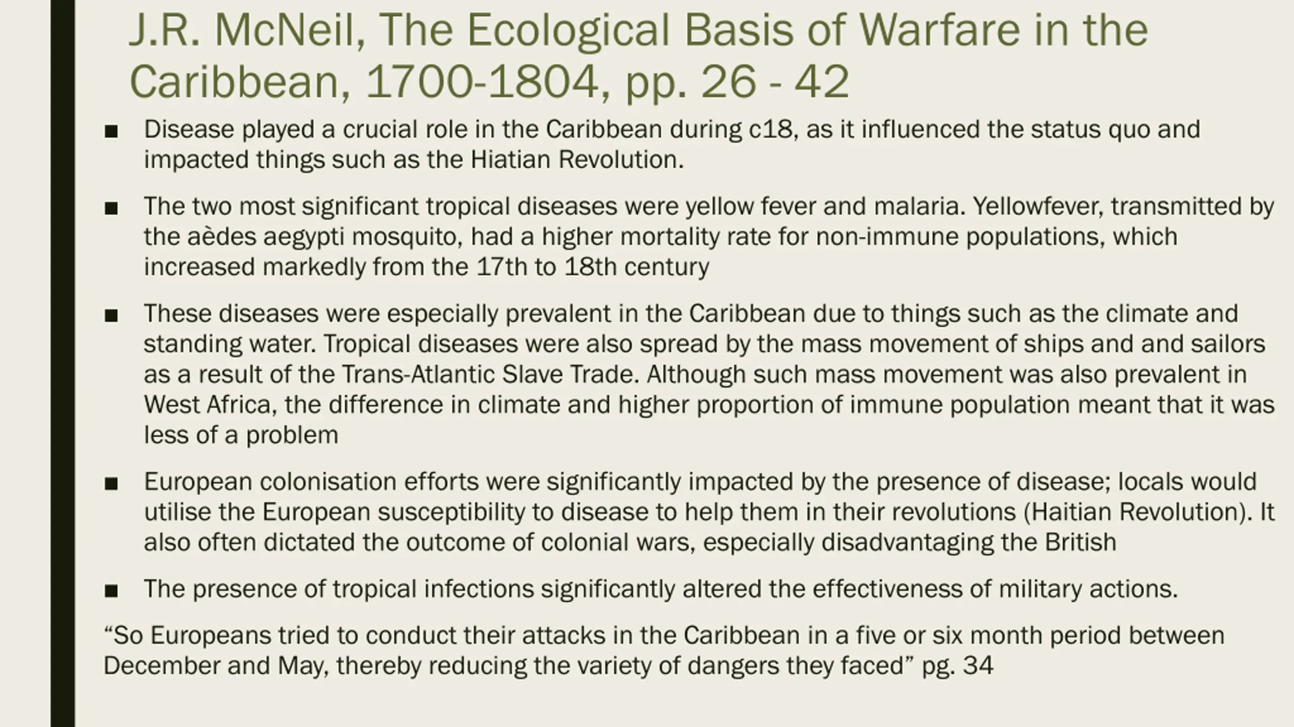 J.R. McNeil, The Ecological Basis of Warfare in the Caribbean, 1700-1804, pp. 26 - 42 Disease played a crucial role in the Caribbean during c18, as it influenced the status quo and impacted things such as the Hiatian Revolution. The two most significant tropical diseases were yellow fever and malaria. Yellowfever, transmitted by the a des aegypti mosquito, had a higher mortality rate for non-immune populations, which increased markedly from the 17th to 18th century These diseases were especially prevalent in the Caribbean due to things such as the climate and standing water. Tropical diseases were also spread by the mass movement of ships and and sailors as a result of the Trans-Atlantic Slave Trade. Although such mass movement was also prevalent in West Africa, the difference in climate and higher proportion of immune population meant that it was less of a problem European colonisation efforts were significantly impacted by the presence of disease; locals would utilise the European susceptibility to disease to help them in their revolutions (Haitian Revolution). It also often dictated the outcome of colonial wars, especially disadvantaging the British The presence of tropical infections significantly altered the effectiveness of military actions. So Europeans tried to conduct their attacks in the Caribbean in a five or six month period between December and May, thereby reducing the variety of dangers they faced pg. 34
