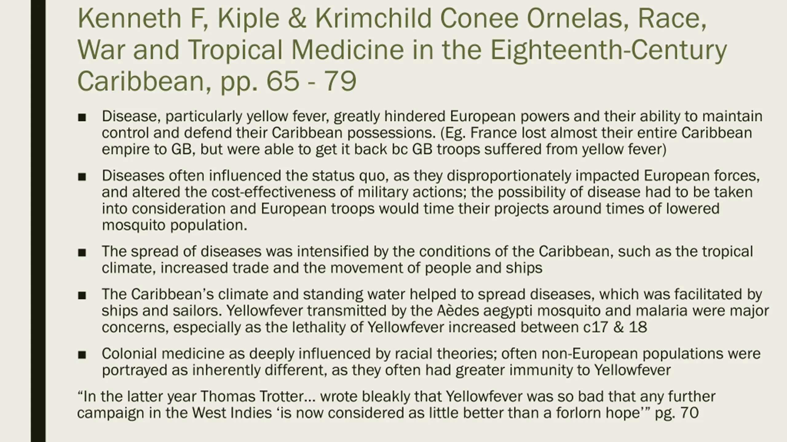 Kenneth F, Kiple & Krimchild Conee Ornelas, Race, War and Tropical Medicine in the Eighteenth-Century Caribbean, pp. 65 - 79 Disease, particularly yellow fever, greatly hindered European powers and their ability to maintain control and defend their Caribbean possessions. (Eg. France lost almost their entire Caribbean empire to GB, but were able to get it back bc GB troops suffered from yellow fever) Diseases often influenced the status quo, as they disproportionately impacted European forces, and altered the cost-effectiveness of military actions; the possibility of disease had to be taken into consideration and European troops would time their projects around times of lowered mosquito population. The spread of diseases was intensified by the conditions of the Caribbean, such as the tropical climate, increased trade and the movement of people and ships The Caribbean s climate and standing water helped to spread diseases, which was facilitated by ships and sailors. Yellowfever transmitted by the A des aegypti mosquito and malaria were major concerns, especially as the lethality of Yellowfever increased between c17 & 18 Colonial medicine as deeply influenced by racial theories; often non-European populations were portrayed as inherently different, as they often had greater immunity to Yellowfever In the latter year Thomas Trotter wrote bleakly that Yellowfever was so bad that any further campaign in the West Indies is now considered as little better than a forlorn hope pg. 70