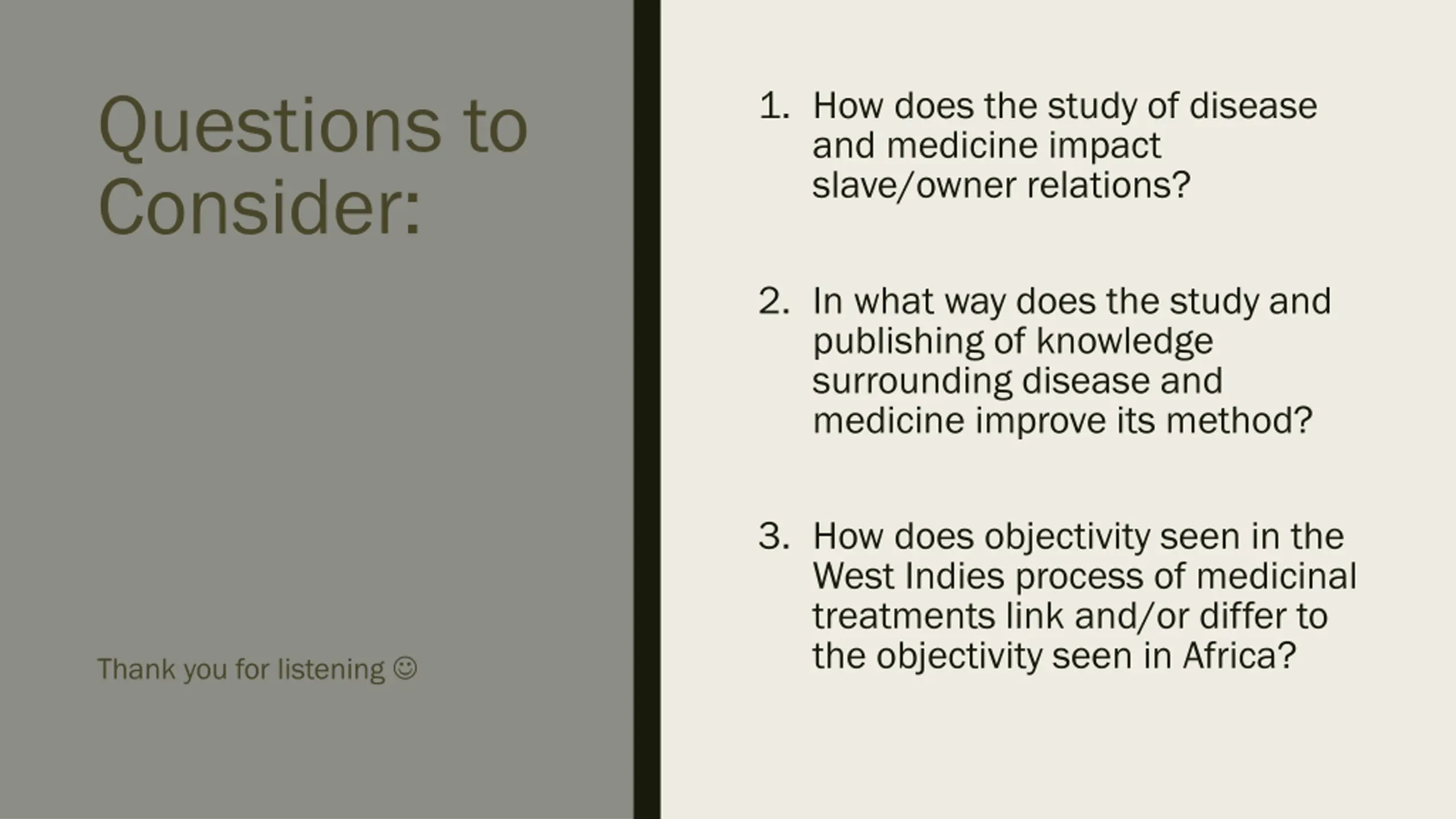 Questions to Consider: 1. How does the study of disease and medicine impact slave/owner relations? 2. In what way does the study and publishing of knowledge surrounding disease and medicine improve its method? 3. How does objectivity seen in the West Indies process of medicinal treatments link and/or differ to the objectivity seen in Africa? Thank you for listening