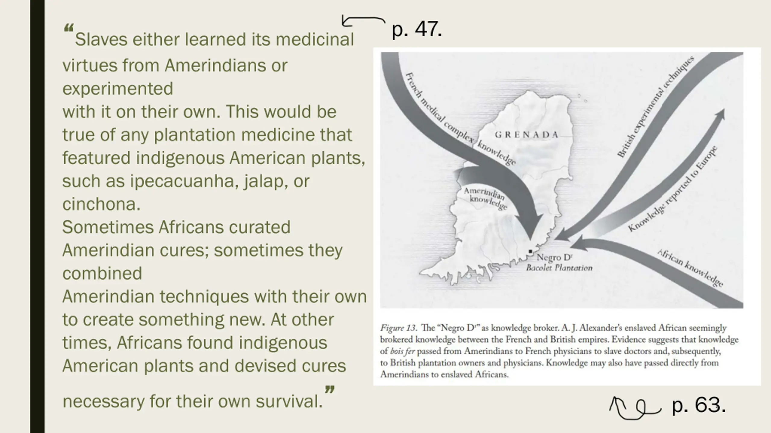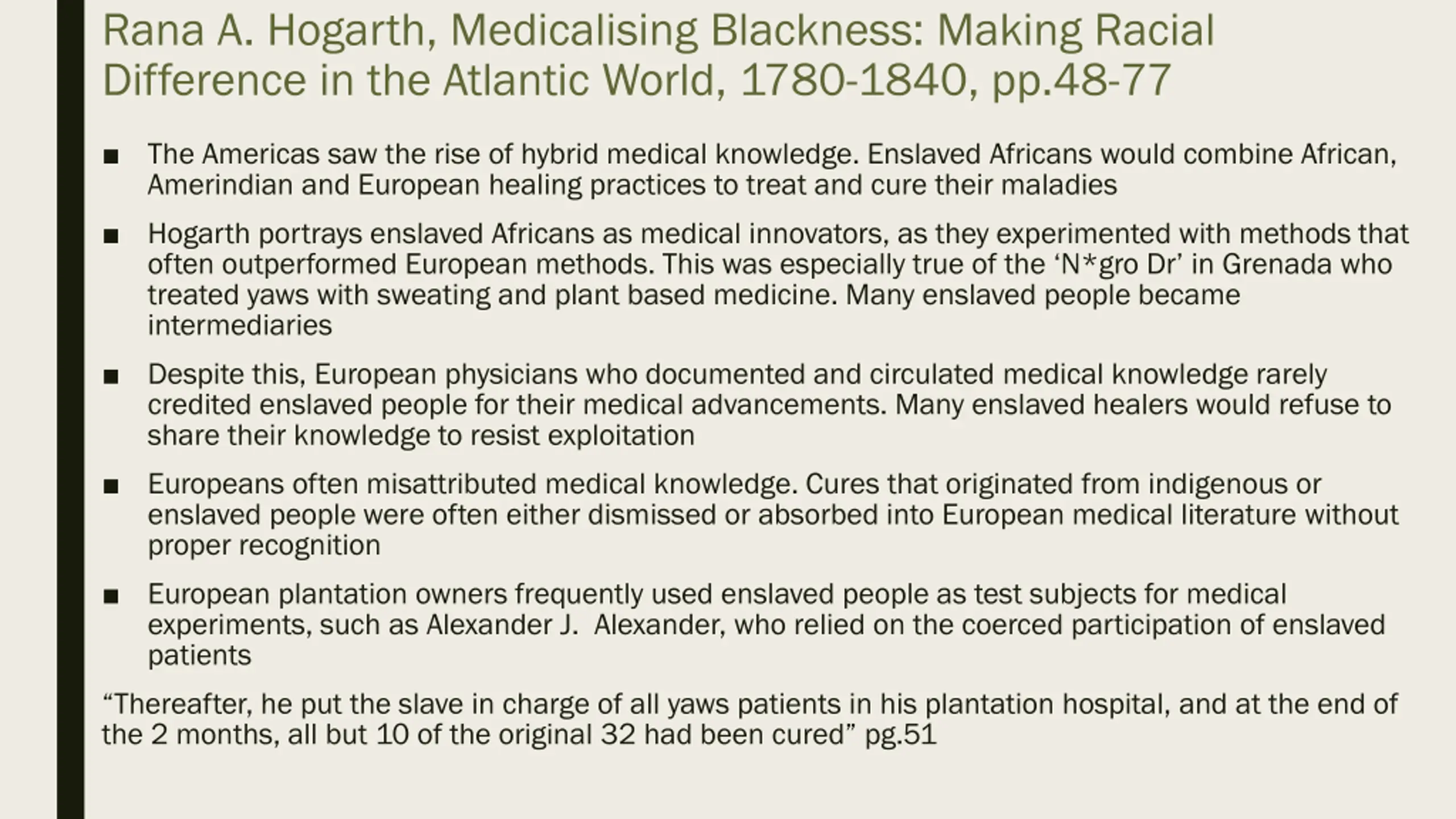 Rana A. Hogarth, Medicalising Blackness: Making Racial Difference in the Atlantic World, 1780-1840, pp.48-77 The Americas saw the rise of hybrid medical knowledge. Enslaved Africans would combine African, Amerindian and European healing practices to treat and cure their maladies Hogarth portrays enslaved Africans as medical innovators, as they experimented with methods that often outperformed European methods. This was especially true of the N*gro Dr in Grenada who treated yaws with sweating and plant based medicine. Many enslaved people became intermediaries Despite this, European physicians who documented and circulated medical knowledge rarely credited enslaved people for their medical advancements. Many enslaved healers would refuse to share their knowledge to resist exploitation Europeans often misattributed medical knowledge. Cures that originated from indigenous or enslaved people were often either dismissed or absorbed into European medical literature without proper recognition European plantation owners frequently used enslaved people as test subjects for medical experiments, such as Alexander J. Alexander, who relied on the coerced participation of enslaved patients Thereafter, he put the slave in charge of all yaws patients in his plantation hospital, and at the end of the 2 months, all but 10 of the original 32 had been cured pg.51