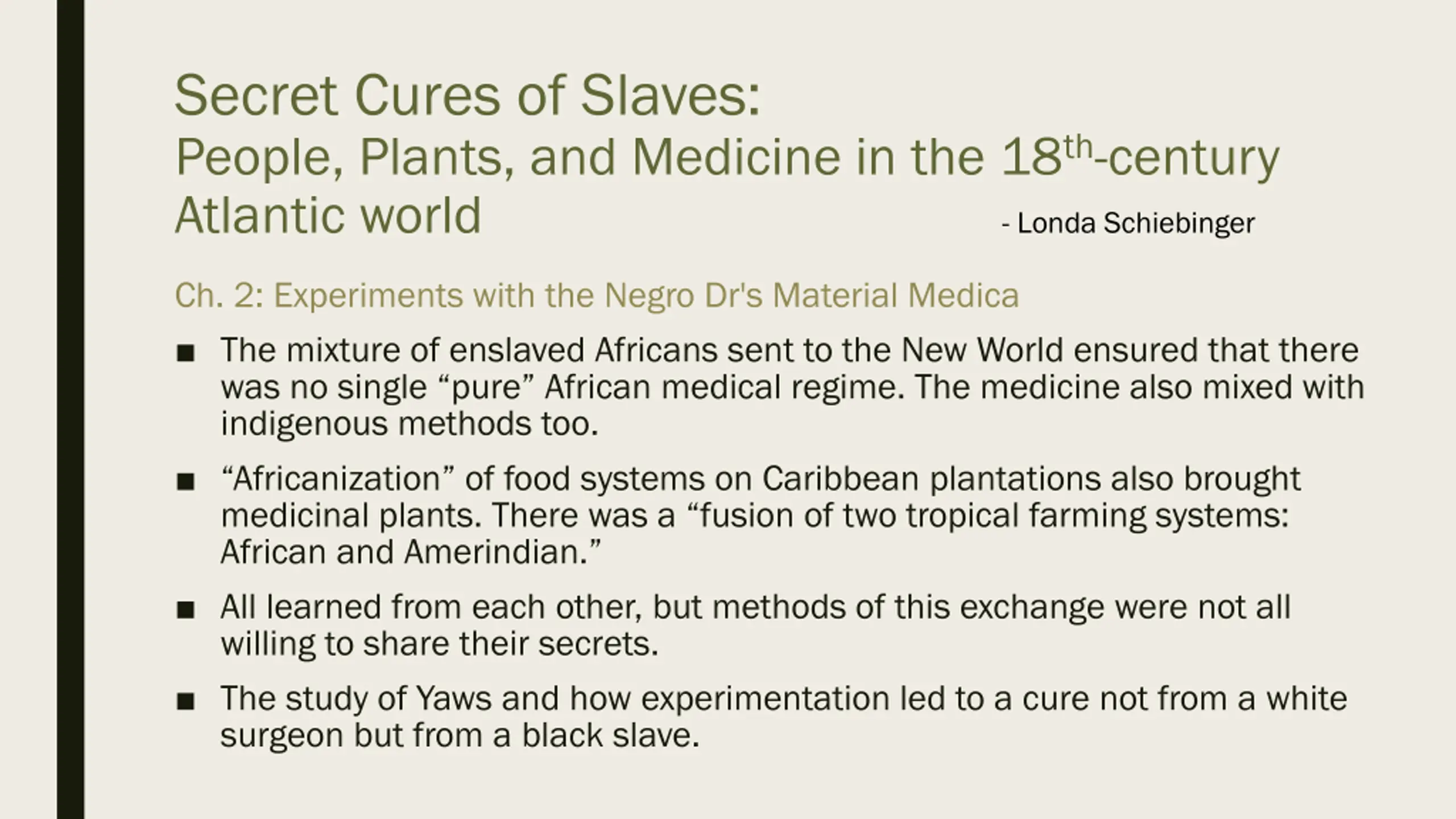 Secret Cures of Slaves: People, Plants, and Medicine in the 18th-century Atlantic world - Londa Schiebinger Ch. 2: Experiments with the Negro Dr's Material Medica The mixture of enslaved Africans sent to the New World ensured that there was no single pure African medical regime. The medicine also mixed with indigenous methods too. Africanization of food systems on Caribbean plantations also brought medicinal plants. There was a fusion of two tropical farming systems: African and Amerindian. All learned from each other, but methods of this exchange were not all willing to share their secrets. The study of Yaws and how experimentation led to a cure not from a white surgeon but from a black slave.