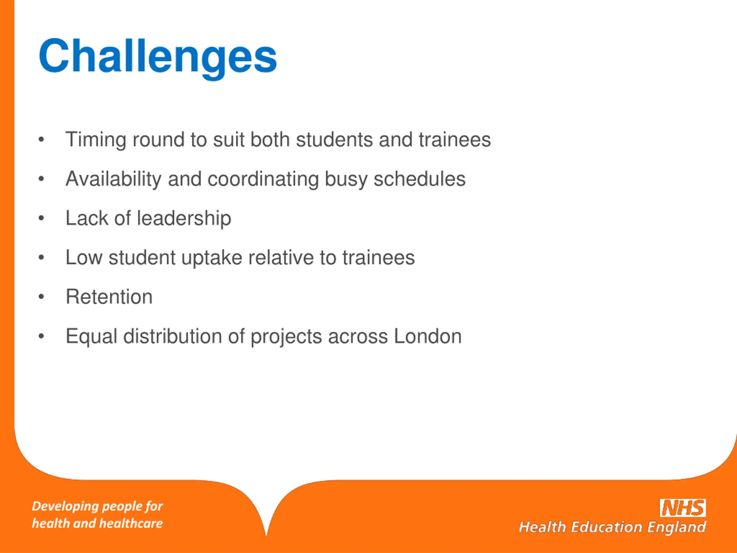 Challenges Timing round to suit both students and trainees Availability and coordinating busy schedules Lack of leadership Low student uptake relative to trainees Retention Equal distribution of projects across London Developing people for health and healthcare