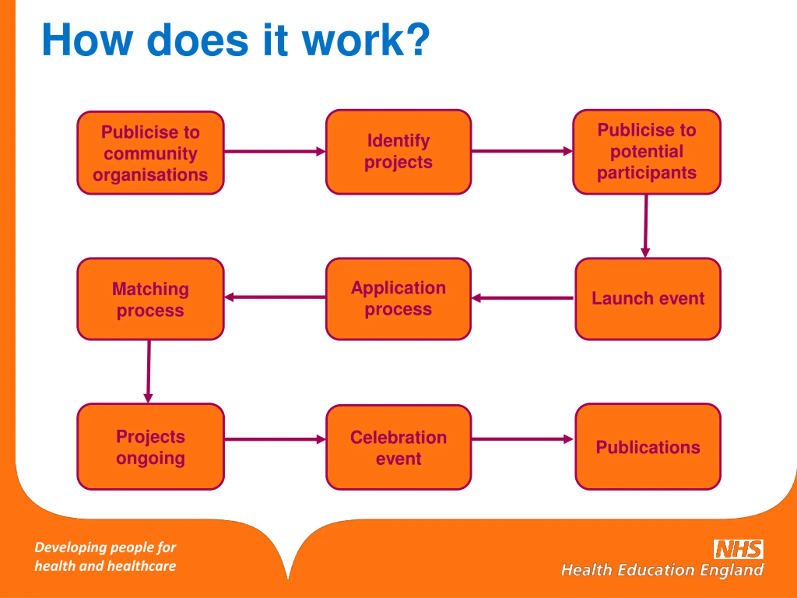How does it work? Publicise to potential participants Publicise to community organisations Identify projects Application process Matching process Launch event Projects ongoing Celebration event Publications Developing people for health and healthcare