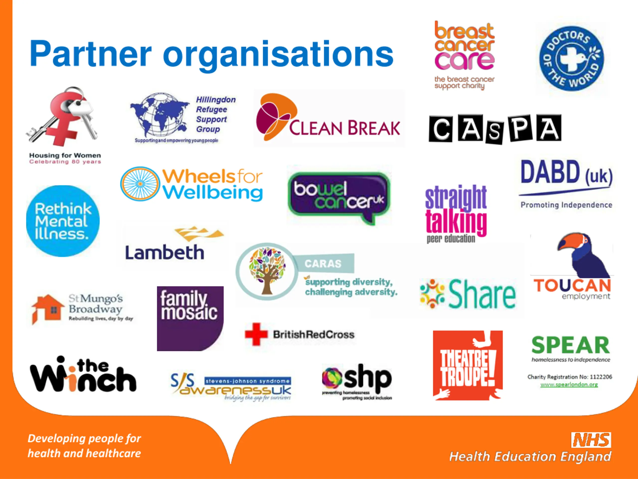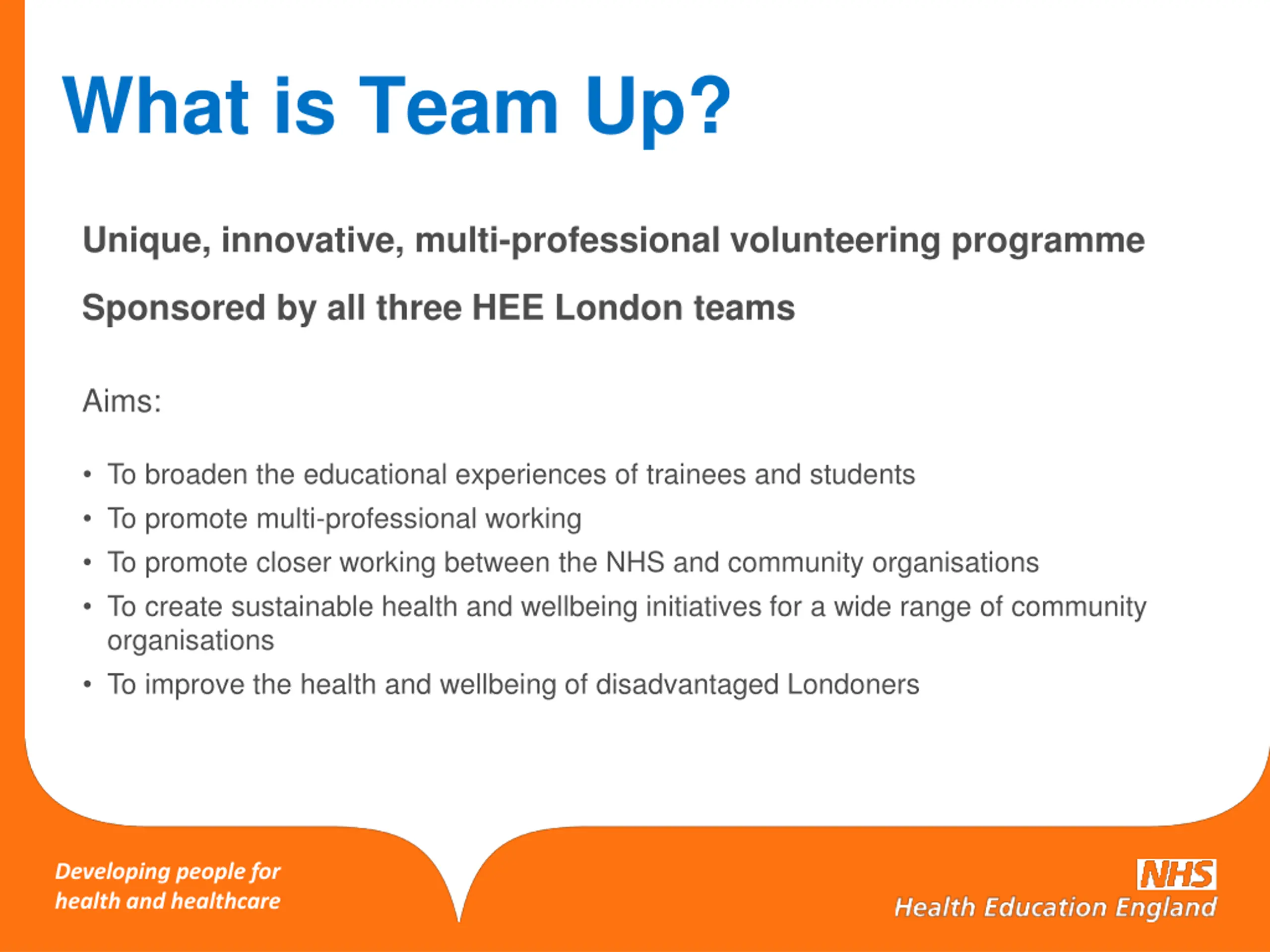 What is Team Up? Unique, innovative, multi-professional volunteering programme Sponsored by all three HEE London teams Aims: To broaden the educational experiences of trainees and students To promote multi-professional working To promote closer working between the NHS and community organisations To create sustainable health and wellbeing initiatives for a wide range of community organisations To improve the health and wellbeing of disadvantaged Londoners Developing people for health and healthcare