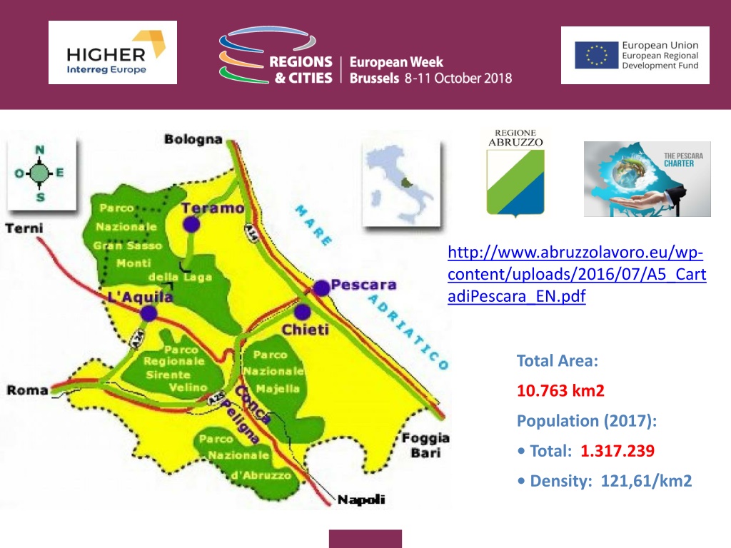 http://www.abruzzolavoro.eu/wp- content/uploads/2016/07/A5_Cart adiPescara_EN.pdf Total Area: 10.763 km2 Population (2017): Total: 1.317.239 Density: 121,61/km2