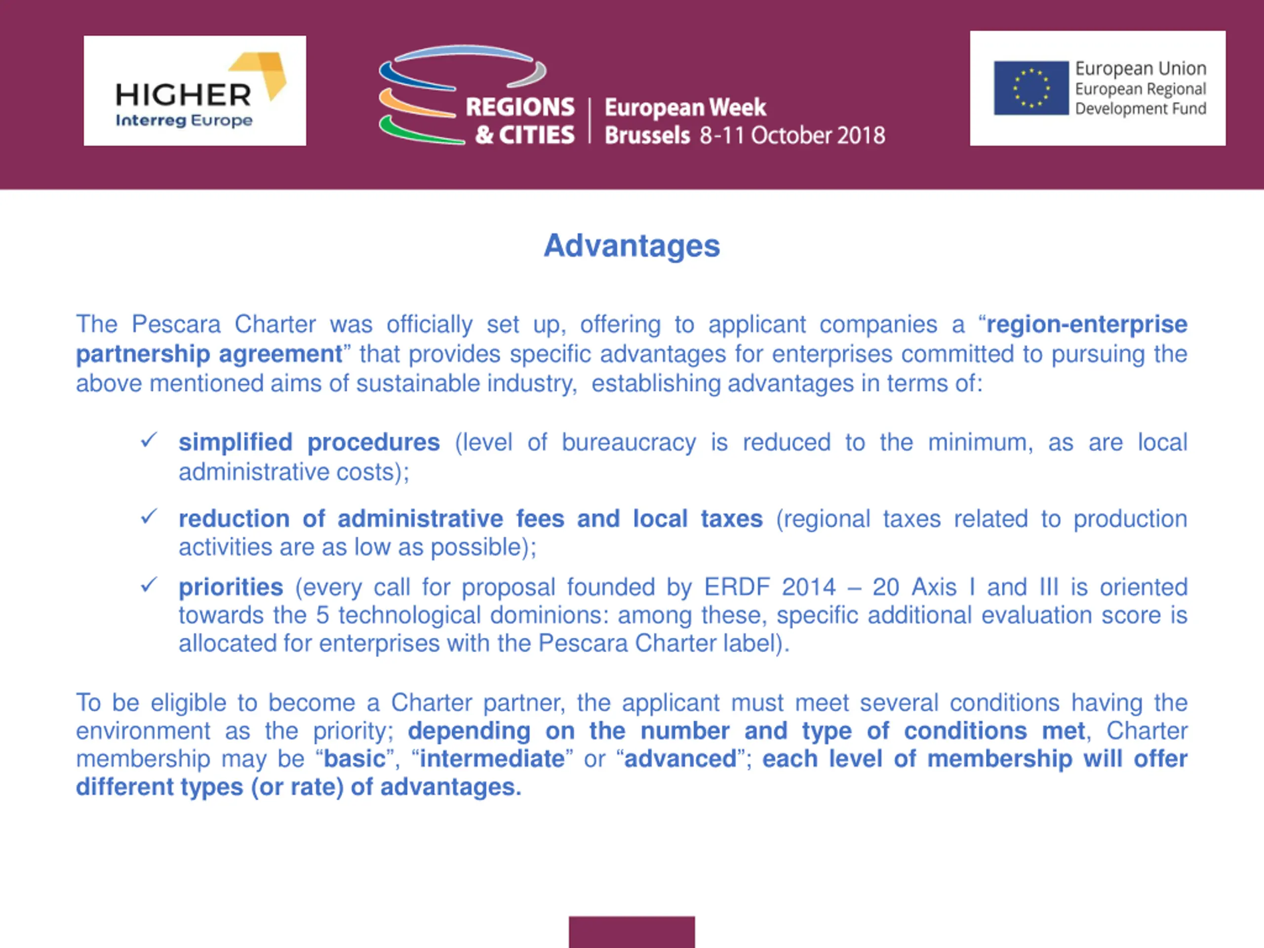 Advantages The Pescara Charter was officially set up, offering to applicant companies a region-enterprise partnership agreement that provides specific advantages for enterprises committed to pursuing the above mentioned aims of sustainable industry, establishing advantages in terms of: simplified procedures (level of bureaucracy is reduced to the minimum, as are local administrative costs); reduction of administrative fees and local taxes (regional taxes related to production activities are as low as possible); priorities (every call for proposal founded by ERDF 2014 20 Axis I and III is oriented towards the 5 technological dominions: among these, specific additional evaluation score is allocated for enterprises with the Pescara Charter label). To be eligible to become a Charter partner, the applicant must meet several conditions having the environment as the priority; depending on the number and type of conditions met, Charter membership may be basic , intermediate or advanced ; each level of membership will offer different types (or rate) of advantages.