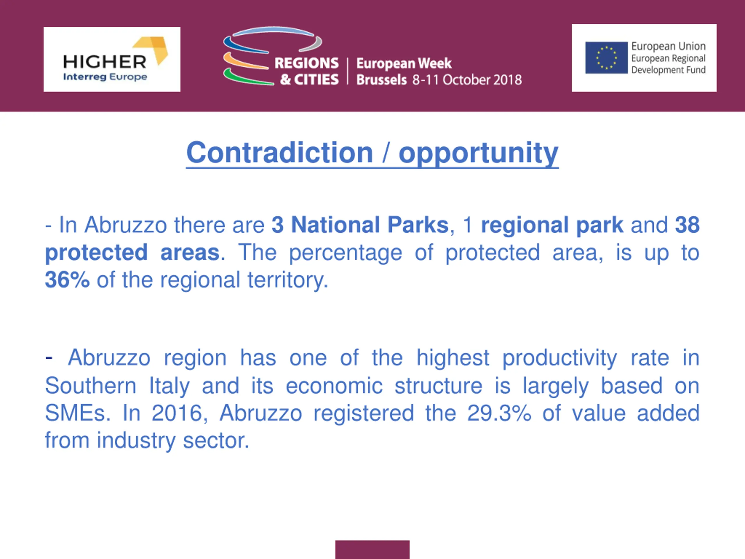Contradiction / opportunity - In Abruzzo there are 3 National Parks, 1 regional park and 38 protected areas. The percentage of protected area, is up to 36% of the regional territory. - Abruzzo region has one of the highest productivity rate in Southern Italy and its economic structure is largely based on SMEs. In 2016, Abruzzo registered the 29.3% of value added from industry sector.