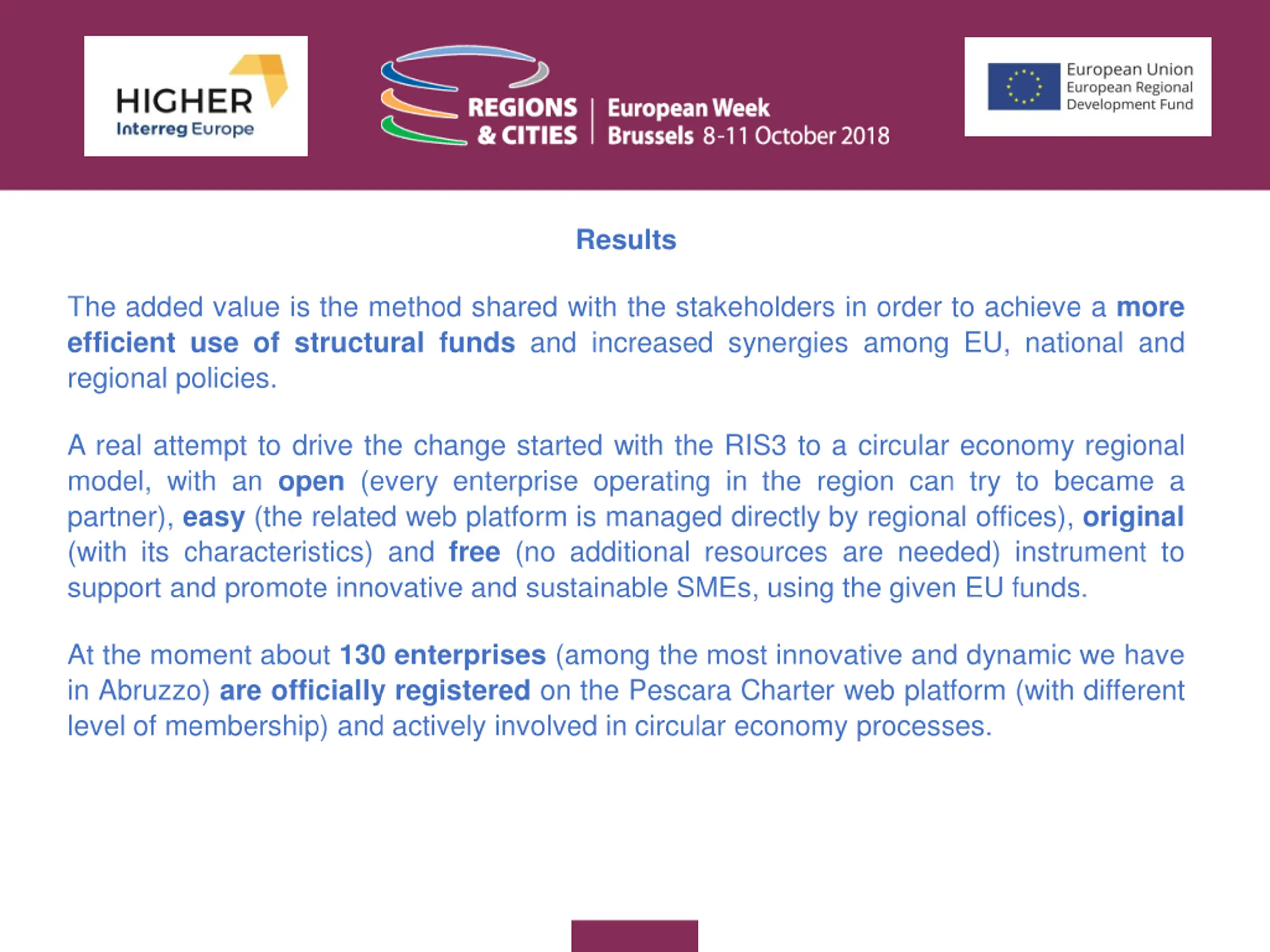 Results The added value is the method shared with the stakeholders in order to achieve a more efficient use of structural funds and increased synergies among EU, national and regional policies. A real attempt to drive the change started with the RIS3 to a circular economy regional model, with an open (every enterprise operating in the region can try to became a partner), easy (the related web platform is managed directly by regional offices), original (with its characteristics) and free (no additional resources are needed) instrument to support and promote innovative and sustainable SMEs, using the given EU funds. At the moment about 130 enterprises (among the most innovative and dynamic we have in Abruzzo) are officially registered on the Pescara Charter web platform (with different level of membership) and actively involved in circular economy processes.